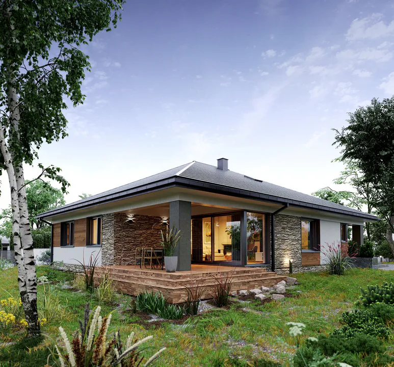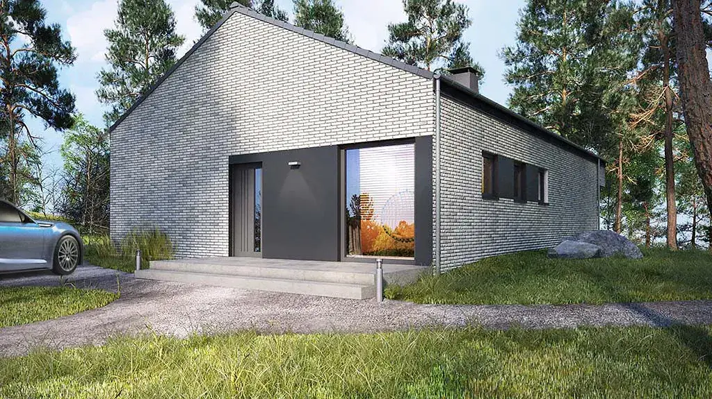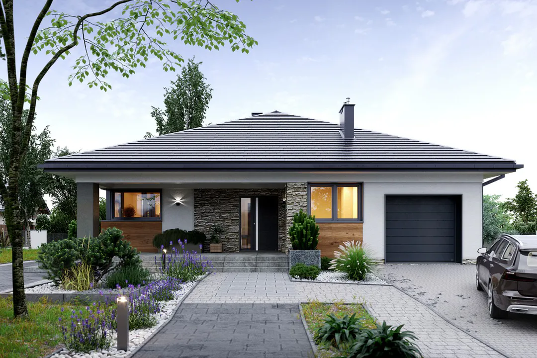 Простую форму дома дополняет четырехскатная крыша, что привлекает внимание своей надежностью и красивым, гармоничным внешним видом.