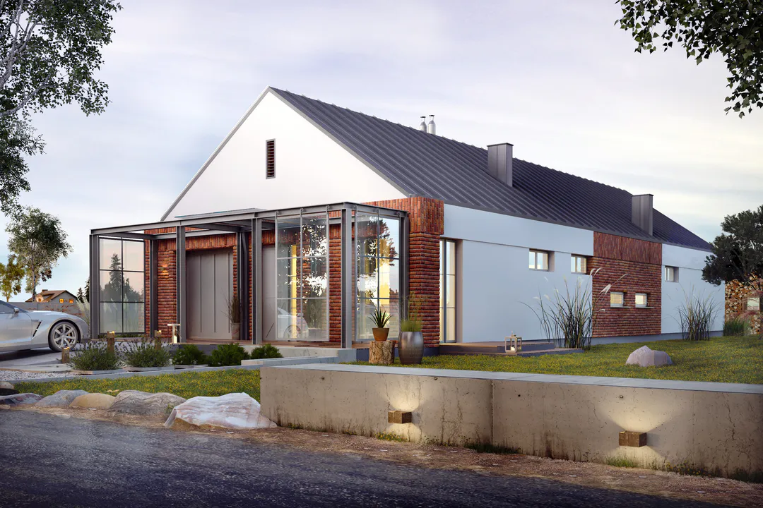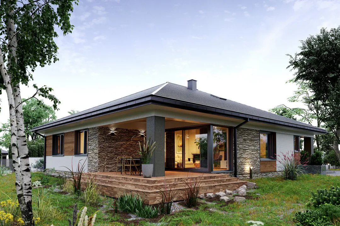 Помимо оригинально оформленного фасада, где белая штукатурка контрастирует с облицовкой под дерево и камнем, акцентируют внимание колонны, расположенные перед входом, в передней части дома и сзади, в зоне террасы.