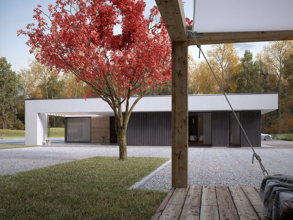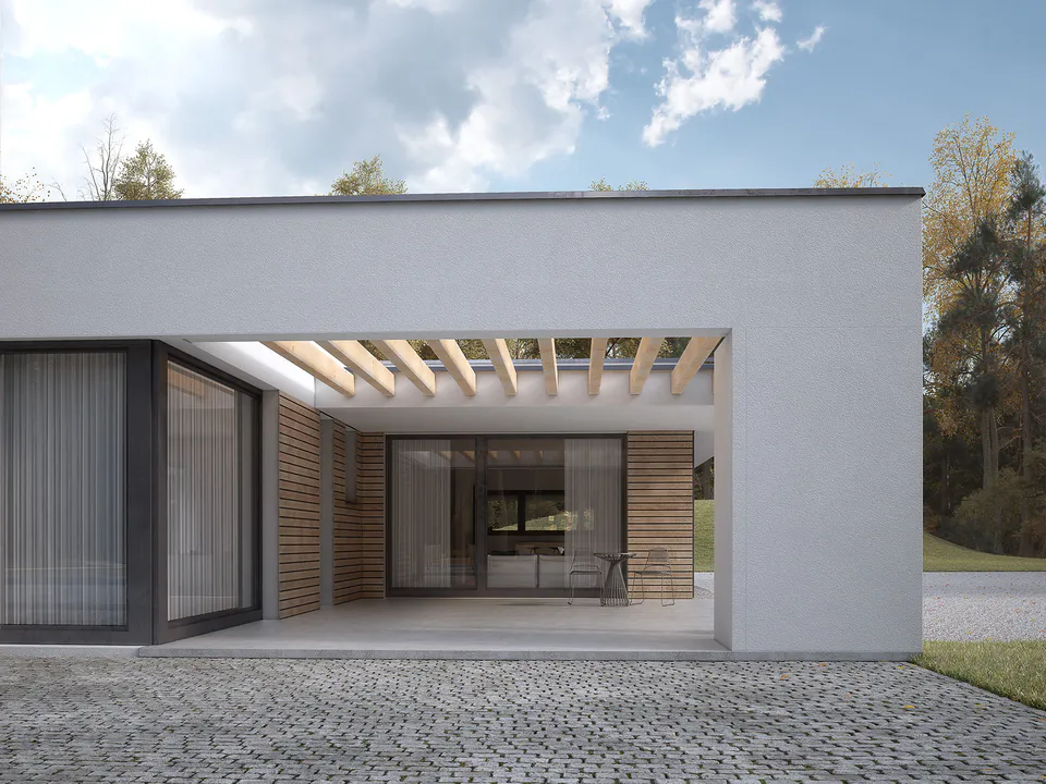 Фасад сочетает белую штукатурку с контрастной облицовкой цвета натурального дерева и облицовкой в оттенках серого. Характерной особенностью являются многочисленные высокие остекления, которые не только подчеркивают современный характер дома, но и обеспечивают большое количество естественного света в интерьере.