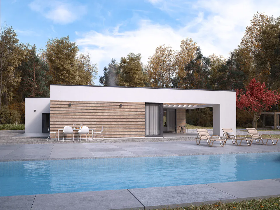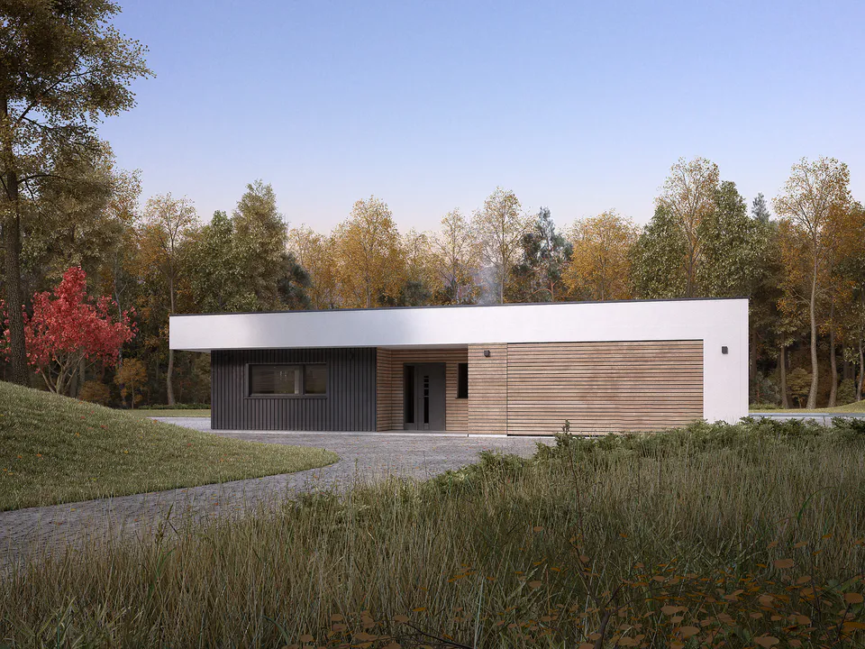 Проект одноэтажного комфортабельного дома с современной архитектурой, плоской крышей и террасой.