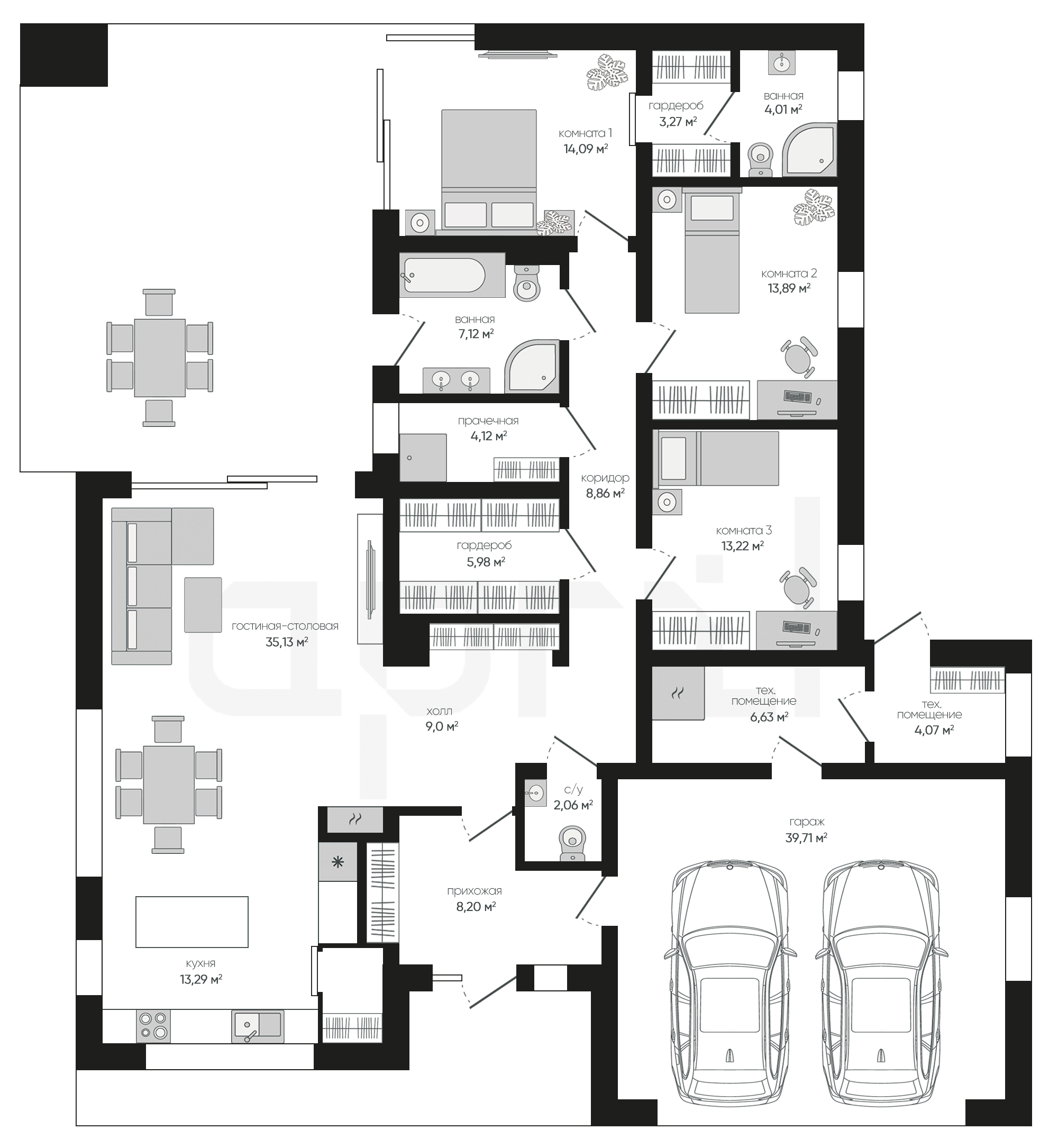 Дом спроектирован прямоугольной формы с гаражом на две машины и плоской крышей, что привлекает внимание, подчеркивая индивидуальный характер дома. Проект также отличается современным фасадом из натуральных материалов.