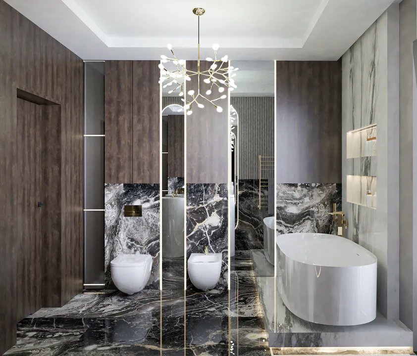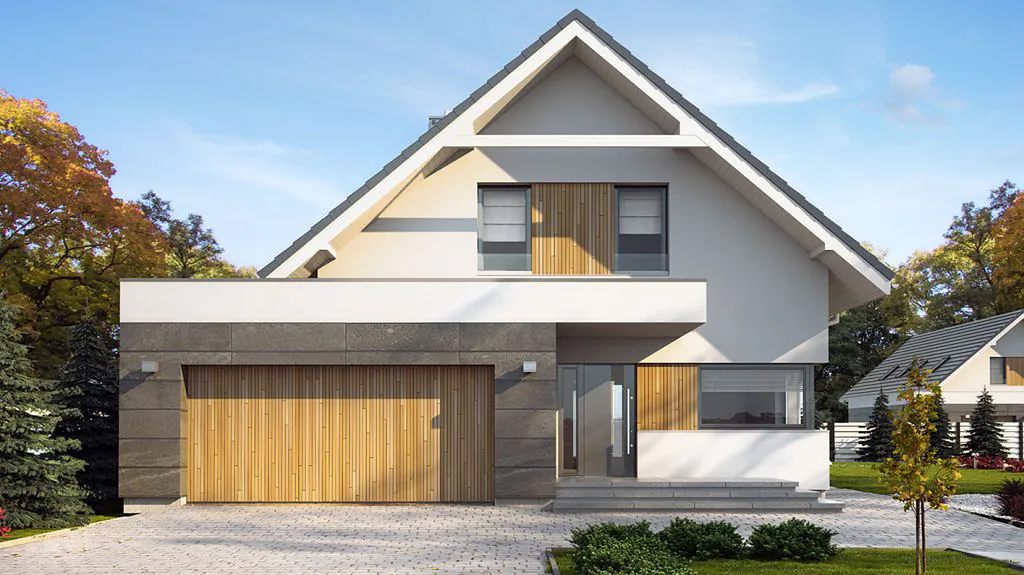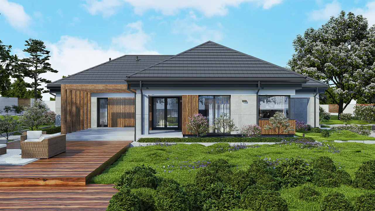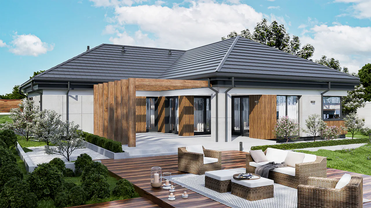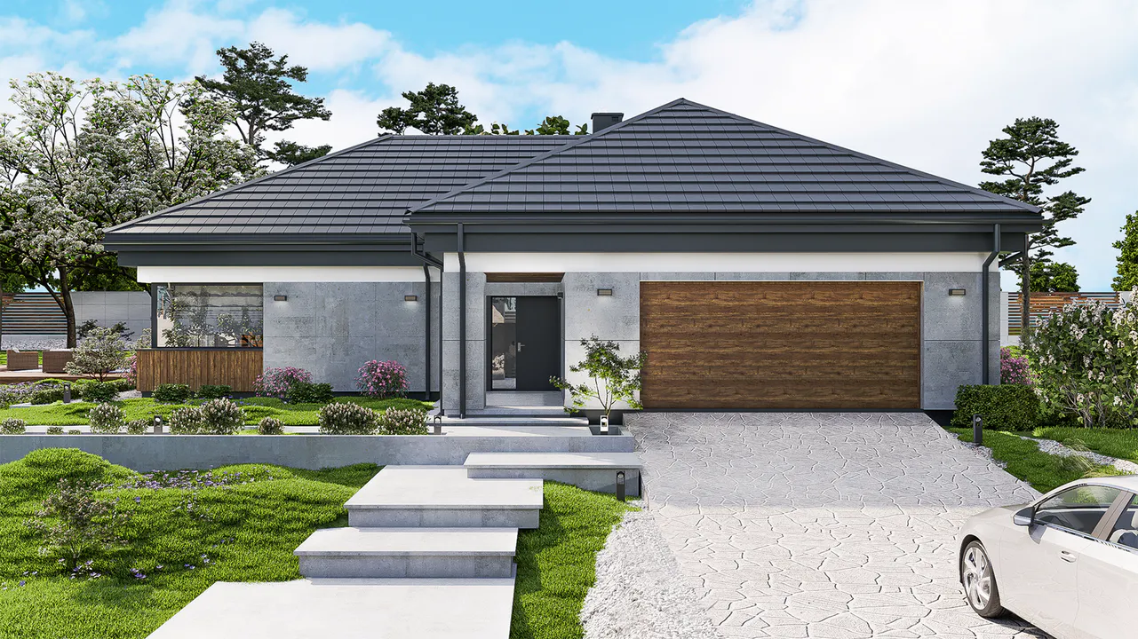 Дом имеет современный и элегантный дизайн с серой крышей, фасадом из серого камня и отделкой из дерева, добавляющей уюта и тепла. Крыша четырехскатная, покрыта керамической черепицей, что гармонично сочетается с общим стилем дома.