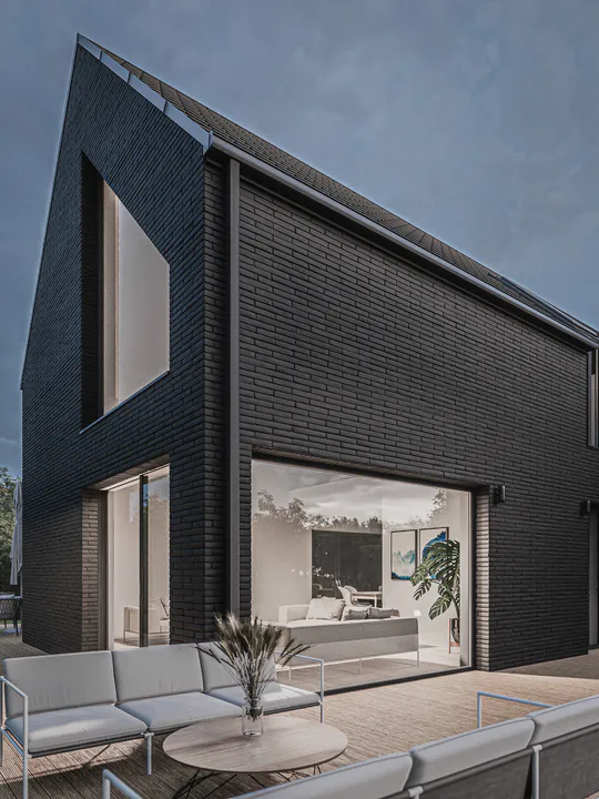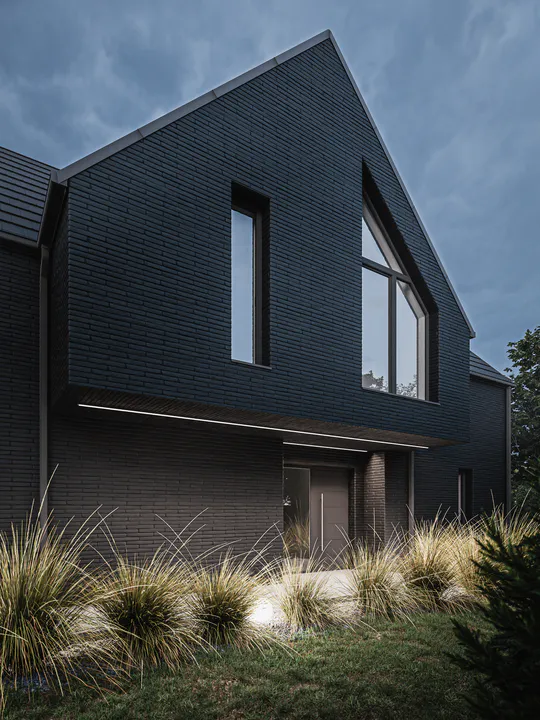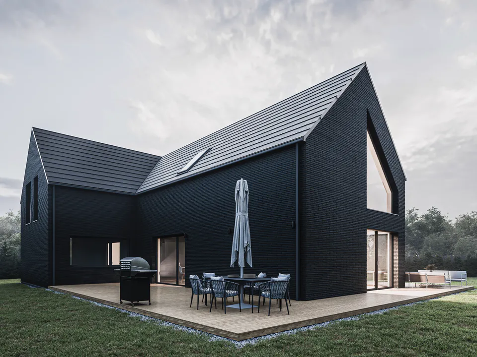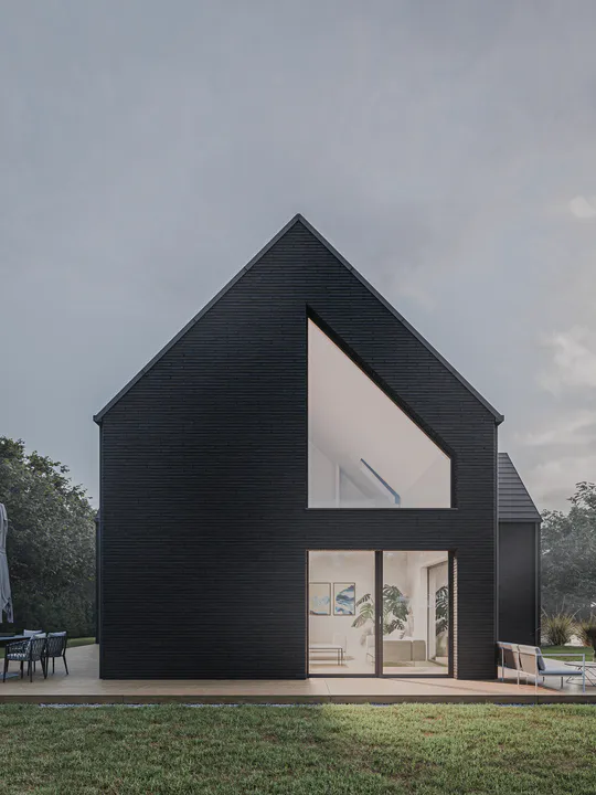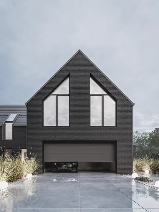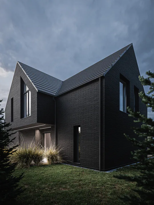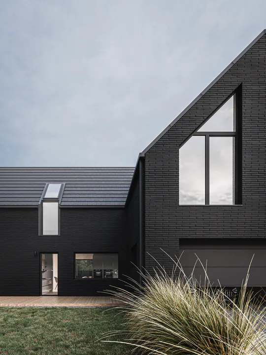 Черный фасад из минеральной плитки создает эффект контраста с окружающей природой, подчеркивая элегантность дома.