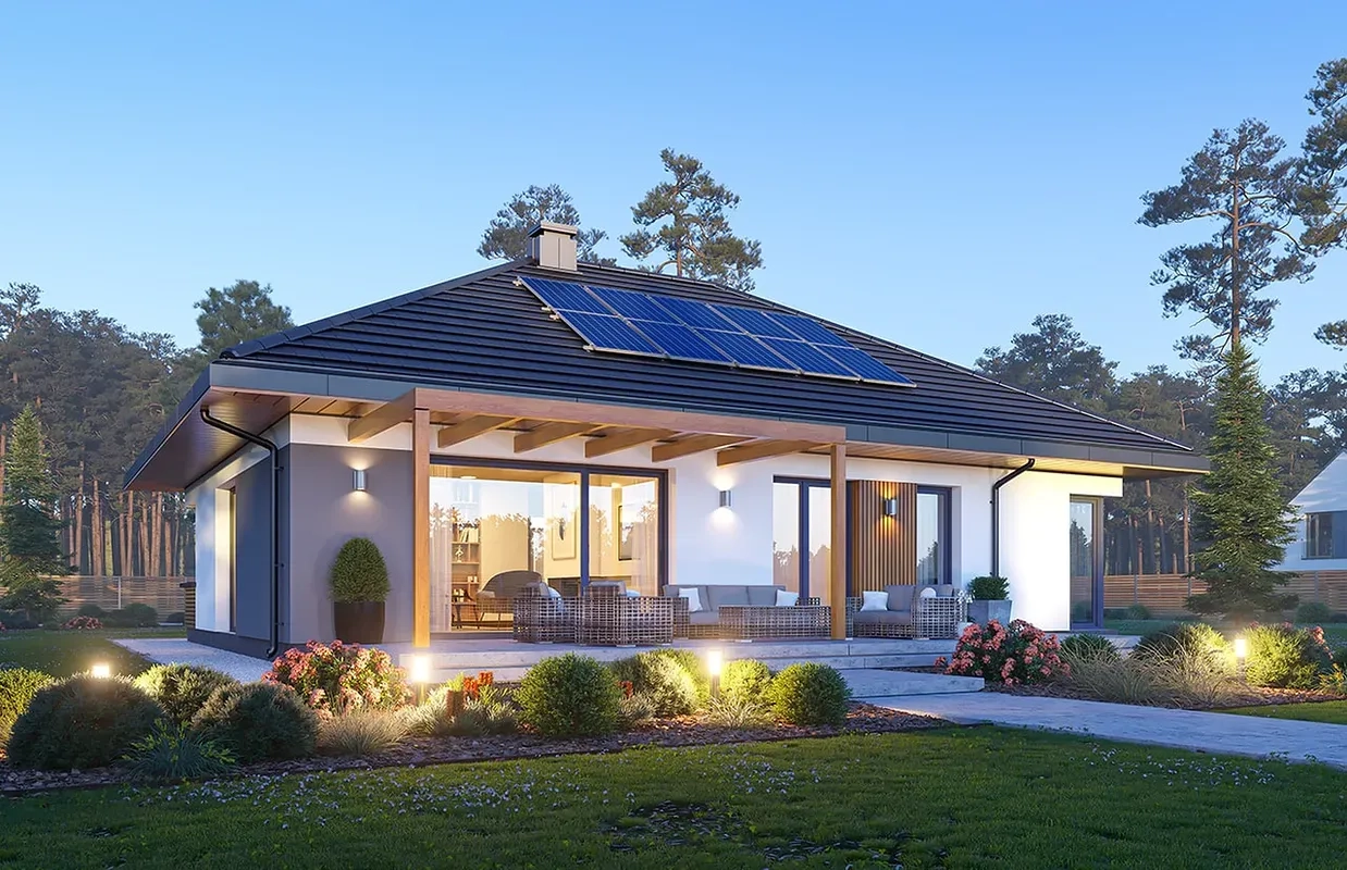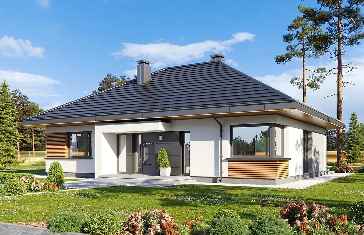Проект одноэтажного дома с двускатной крышей и террасой.
