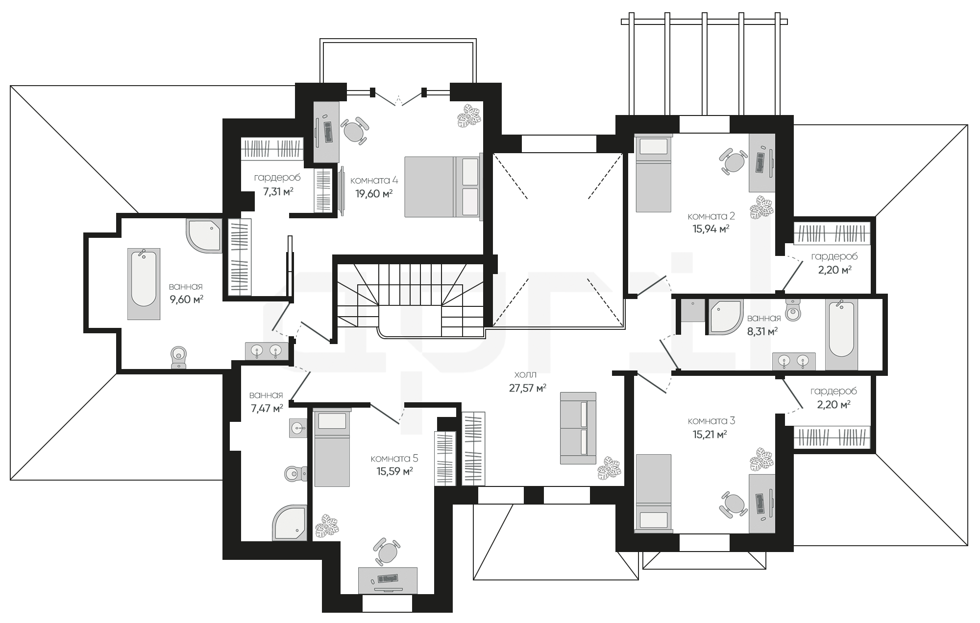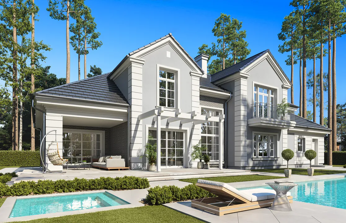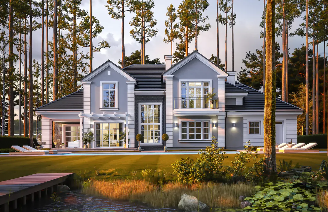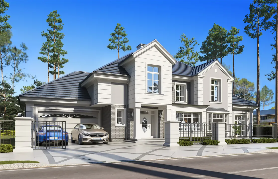 Проект дома обладает выразительной архитектурной концепцией, которая сочетает в себе элементы классического стиля с современными удобствами.