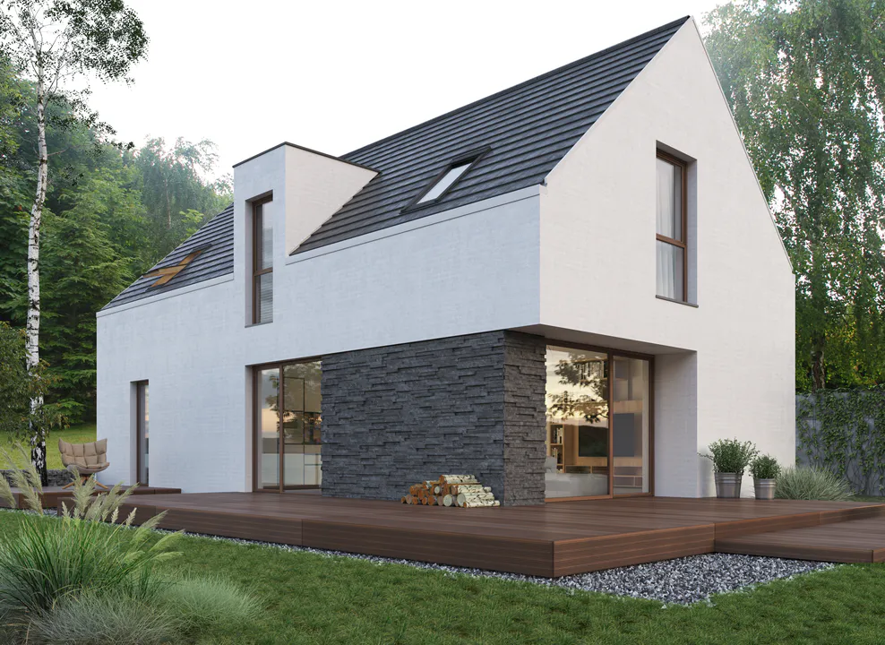 Проект представляет собой современный дом с мансардным этажом, покрытый белой штукатуркой и клинкерной плиткой. Простую форму дома дополняет двухскатная крыша, покрытая керамической черепицей.
