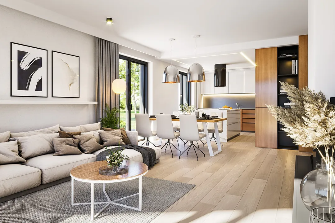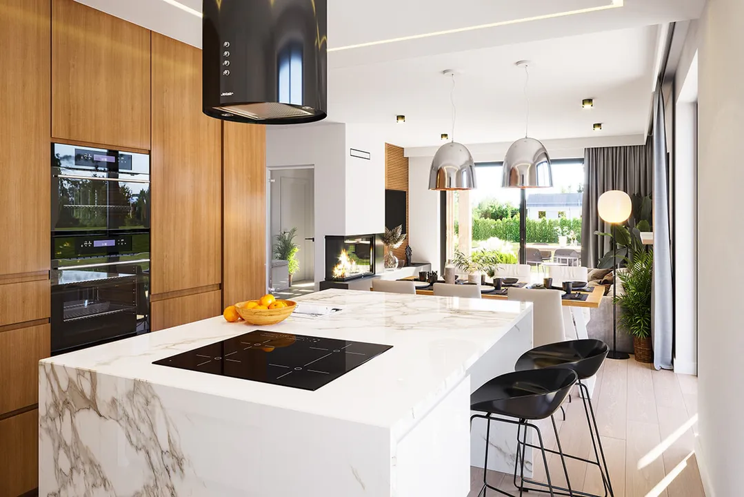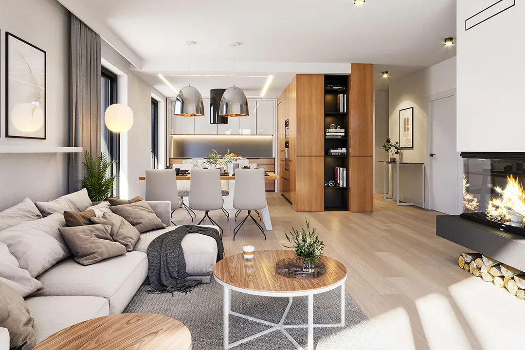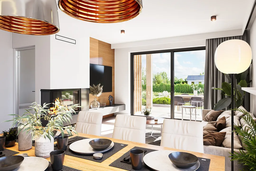 Стиль дома минималистичный, с акцентом на природные материалы.