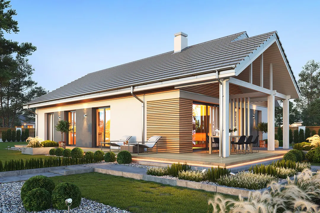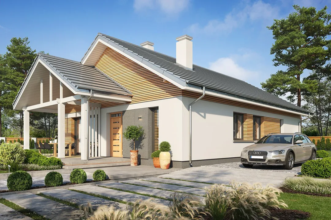 Фасад выполнен в светлых тонах с деревянными элементами, придающими уютный вид.