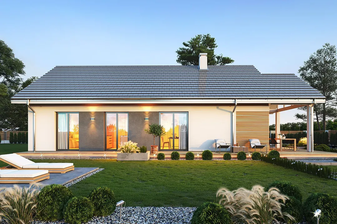 Форма дома простая, современная, в интересной цветовой гамме, с четко прорисованными двускатными крышами и фронтонами. Архитектура дома сочетает в себе интересные, разнообразные детали и создает впечатление элегантности и уюта.