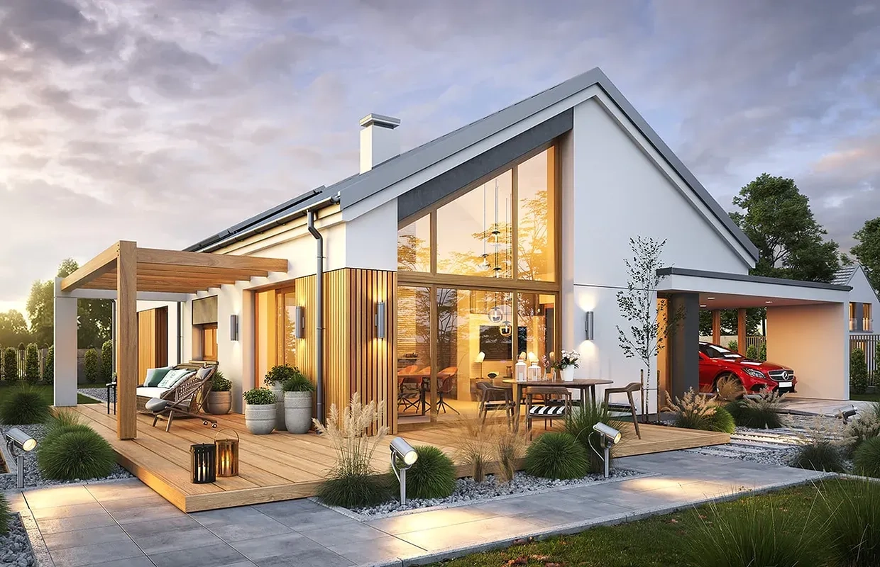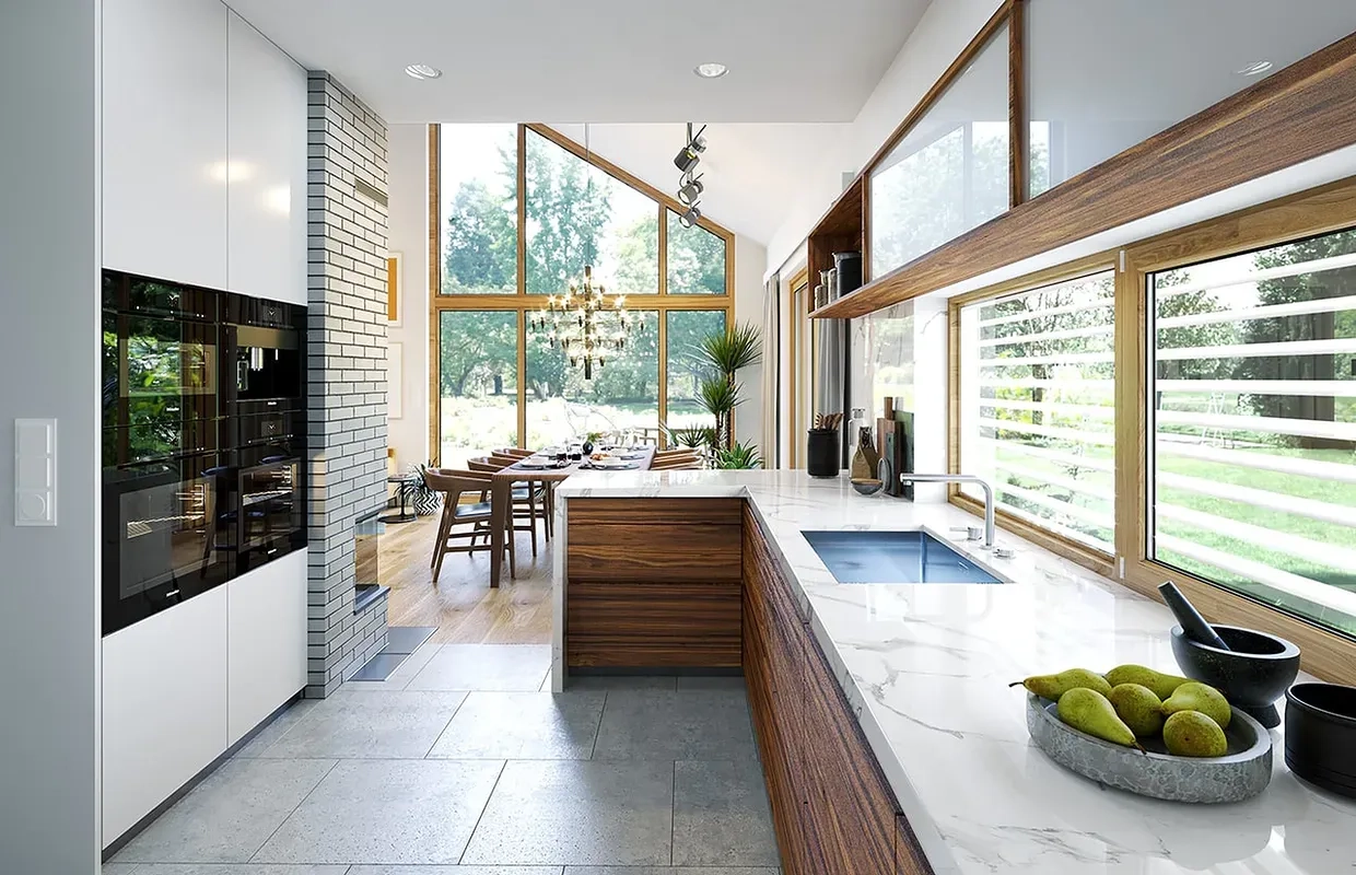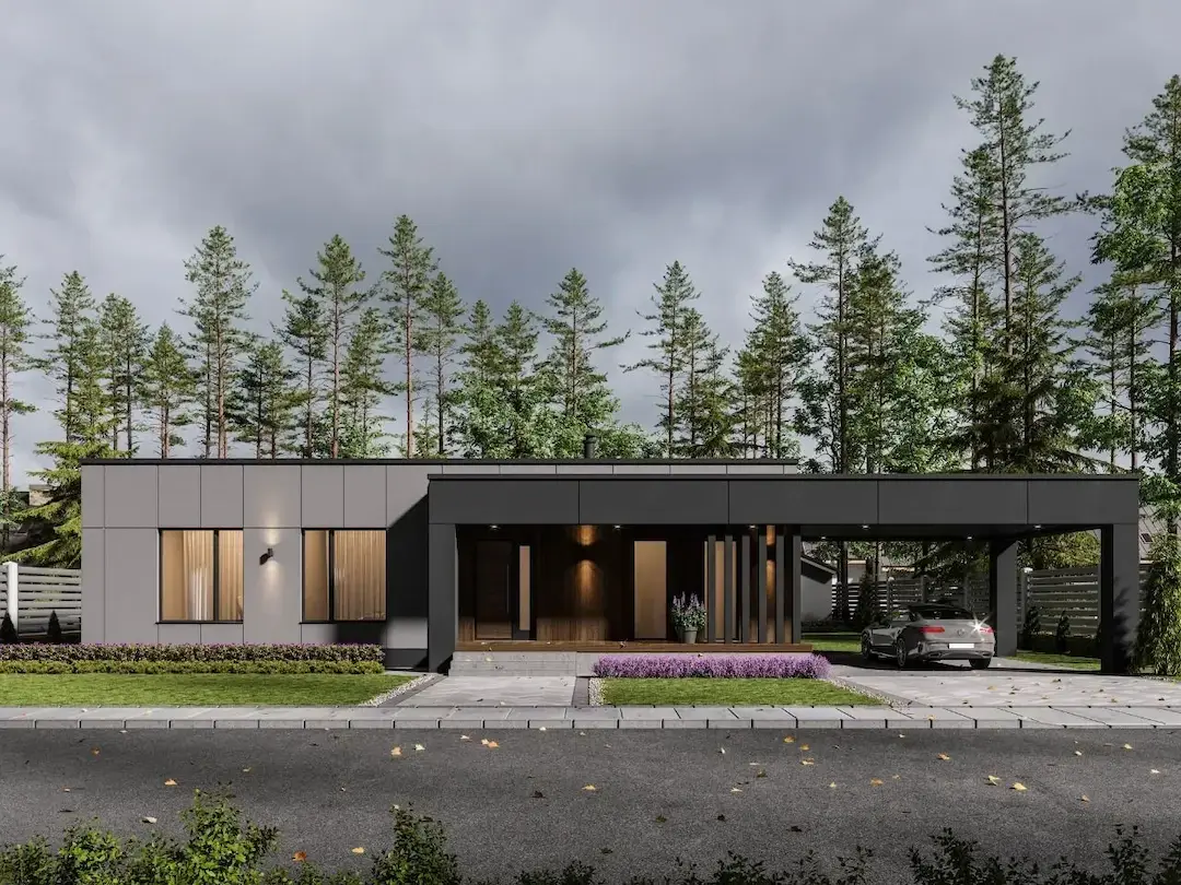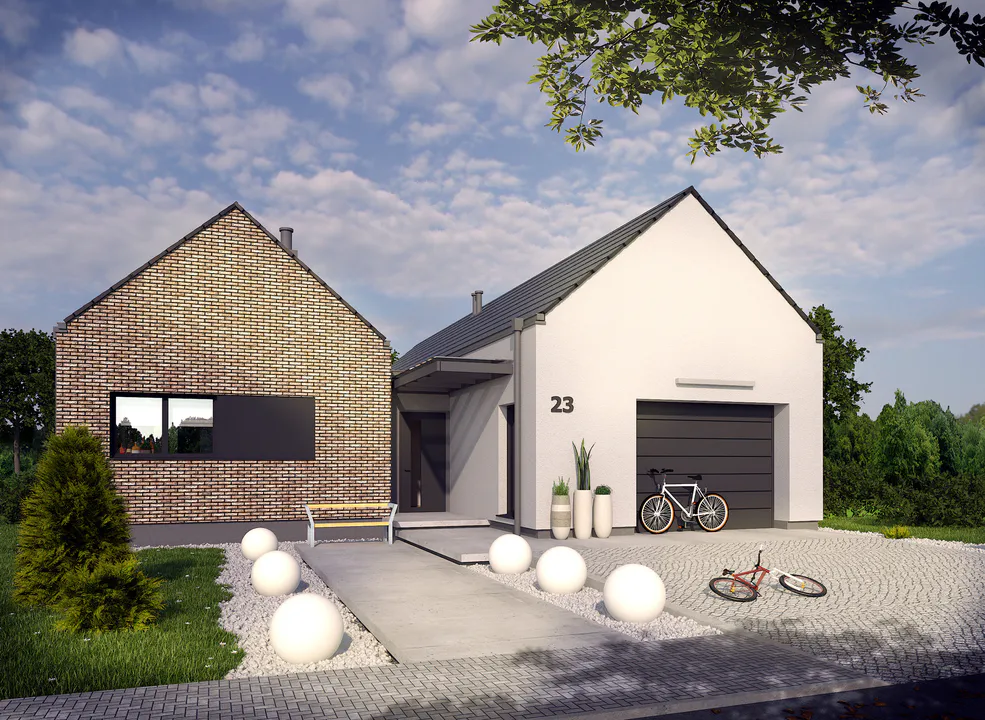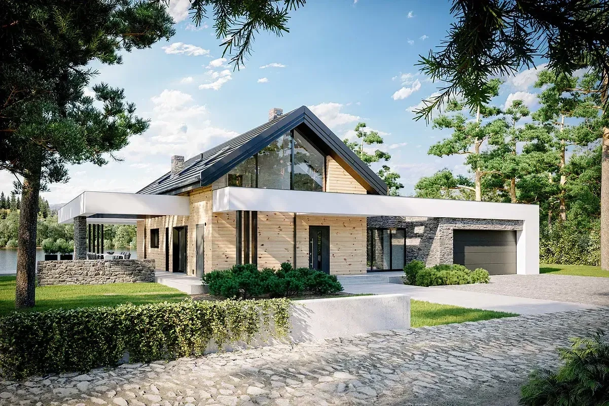 Архитектура дома современная и привлекательная. Форма состоит из простых геометрических форм, объединенных в интересное, оригинальное целое. Дом разнообразен несколькими тонкими деталями, такими как контрастные цвета стен, деревянная облицовка фасада и, прежде всего, большое остекление окон, плоской кровлей над входом и навесом.