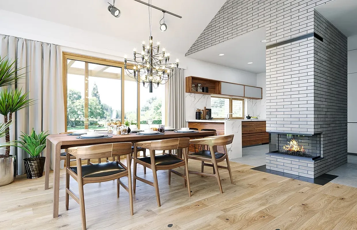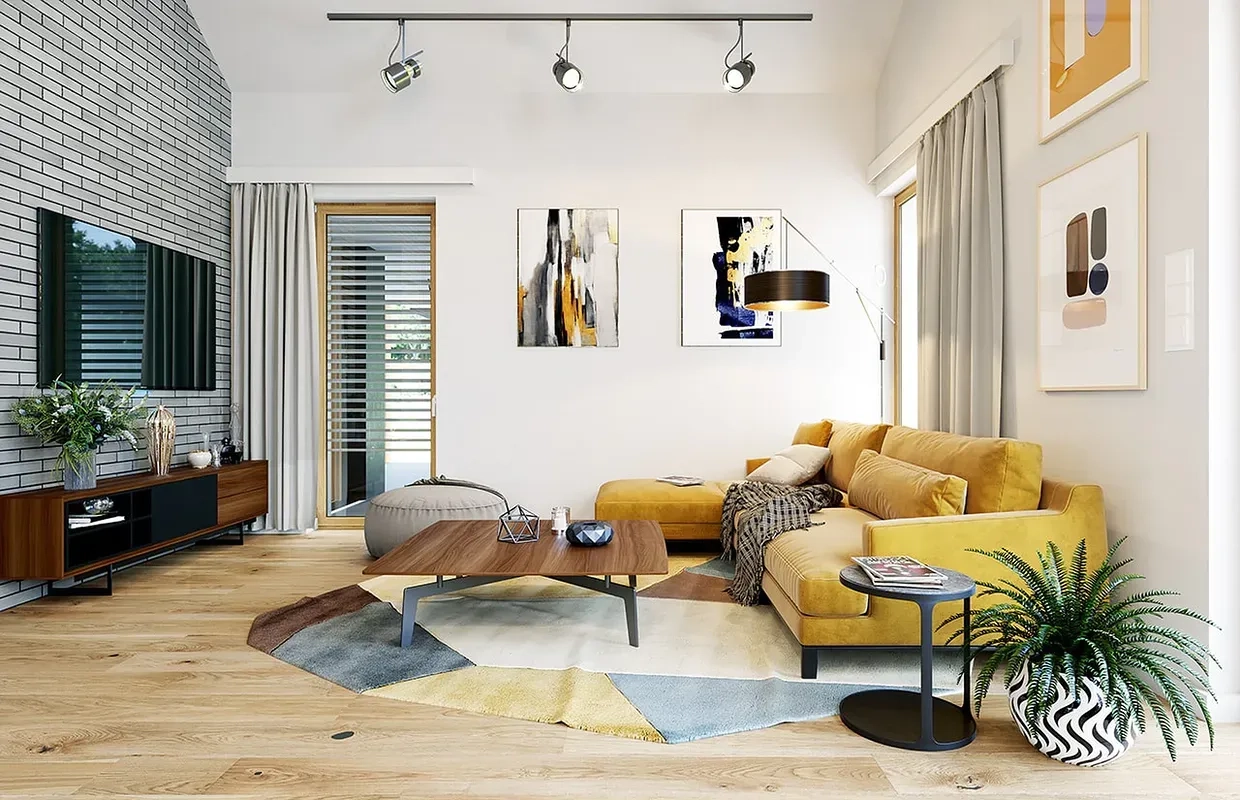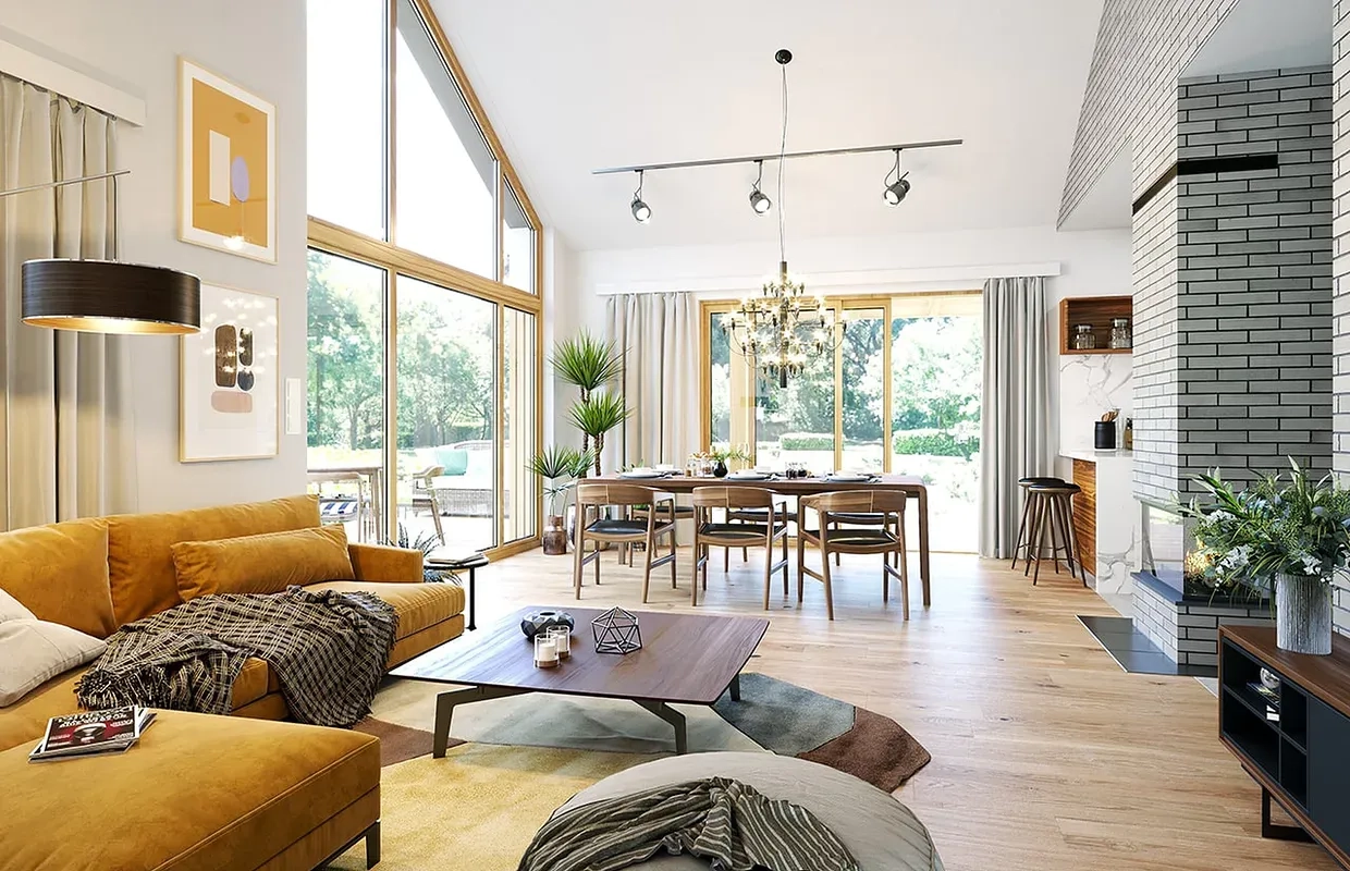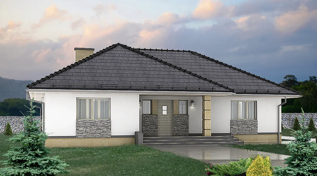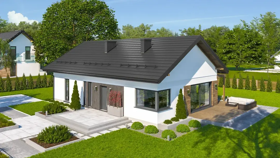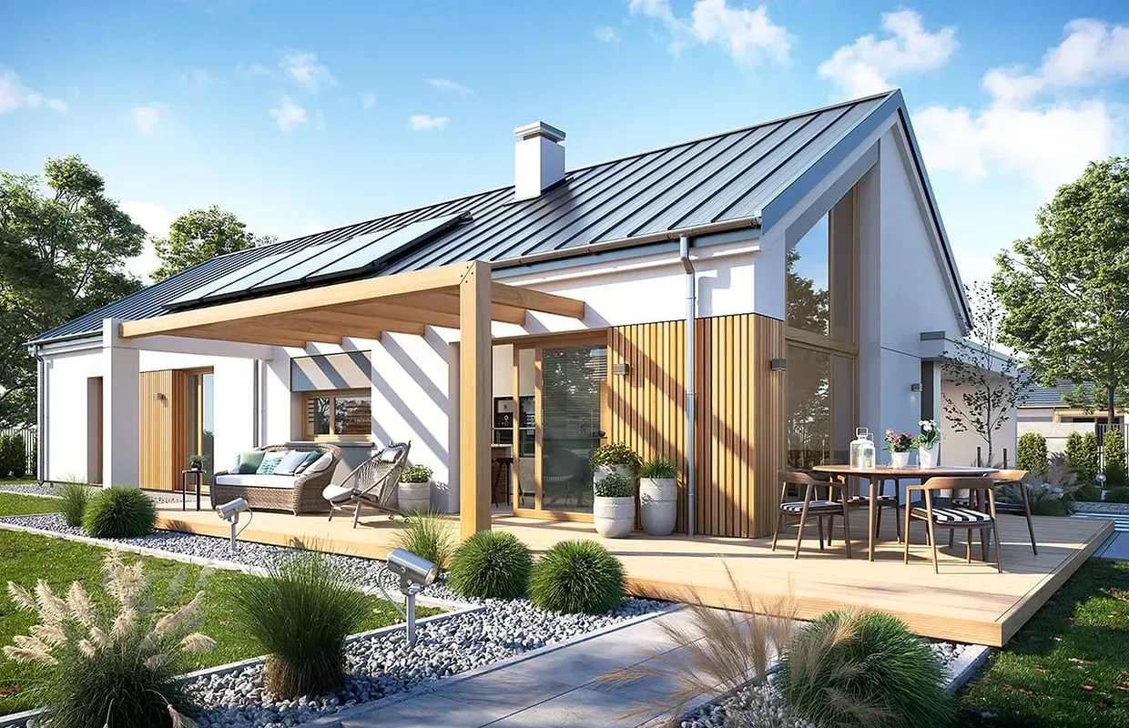 Архитектура дома современная и привлекательная. Форма состоит из простых геометрических форм, объединенных в интересное, оригинальное целое. Дом разнообразен несколькими тонкими деталями, такими как контрастные цвета стен, деревянная облицовка фасада и, прежде всего, большое остекление окон, плоской кровлей над входом и навесом.
