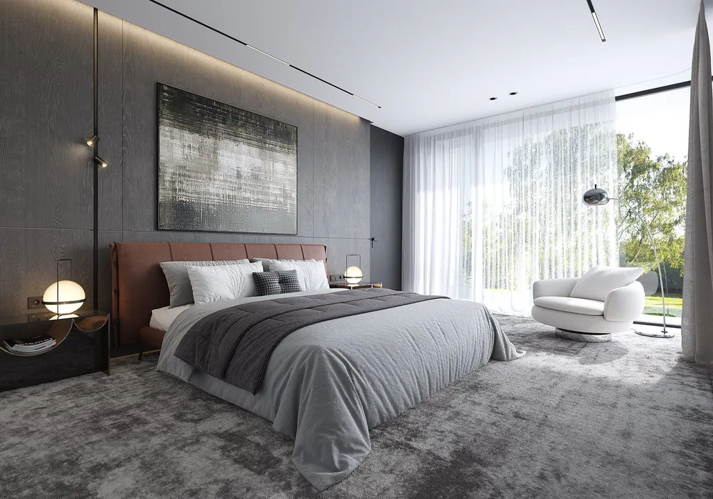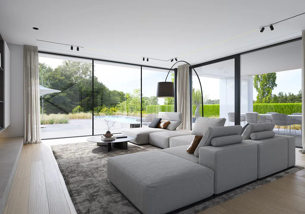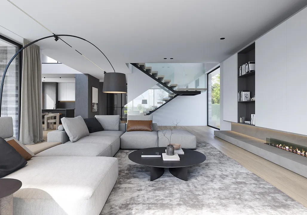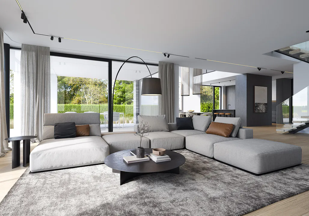 Фасад прекрасно сочетает белую штукатурку и клинкерную плитку ручной формовки, а плоская крыша и панорамное остекление добавляет современности и элегантности дому.