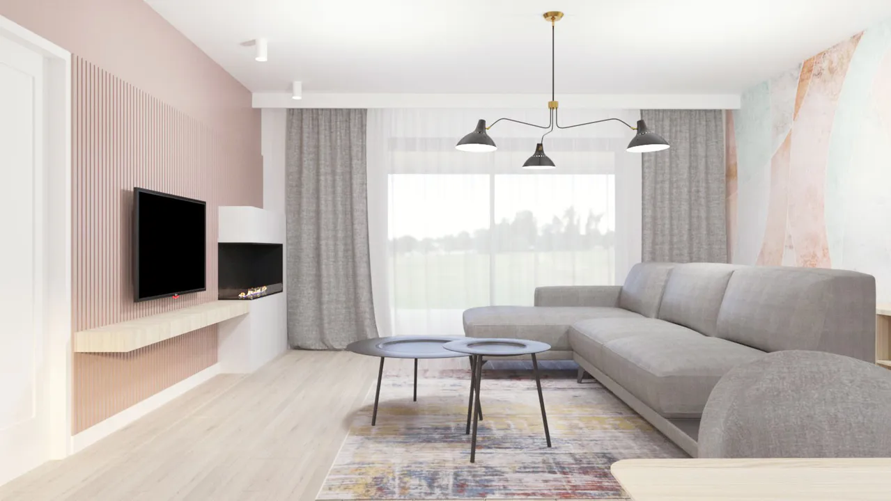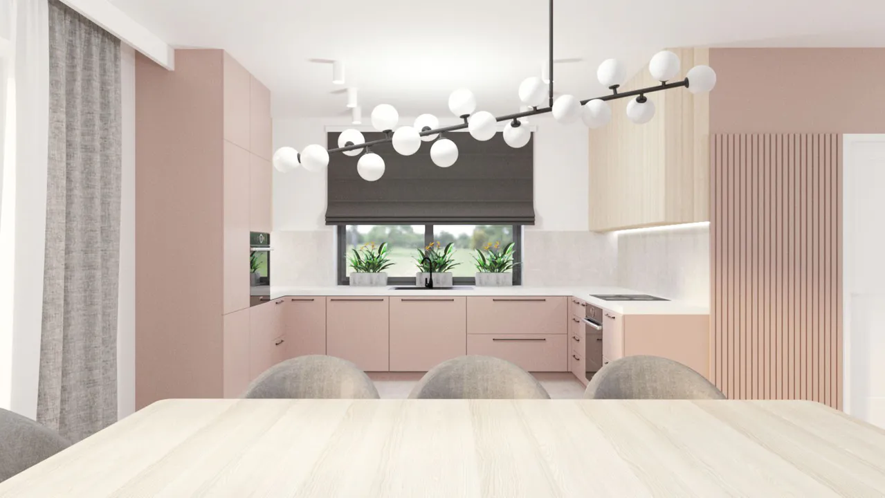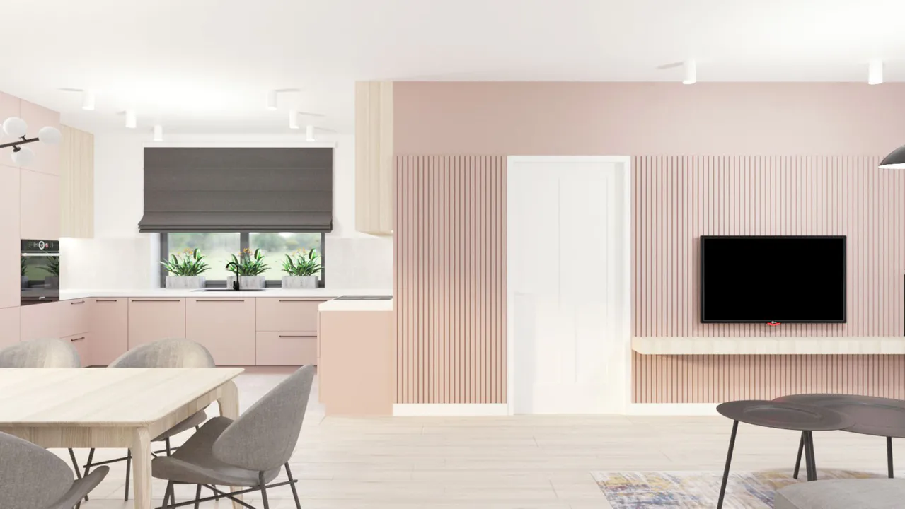 Дом имеет двускатную крышу и плоскую крышу над гаражом. Внешний фасад спроектирован в коричнево-белых тонах. Бетонные беседки с вертикальными столбами, используемые у входа, в навесе и на террасе, придают форме этого дома современный характер.