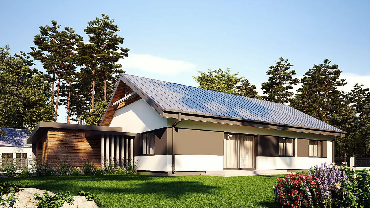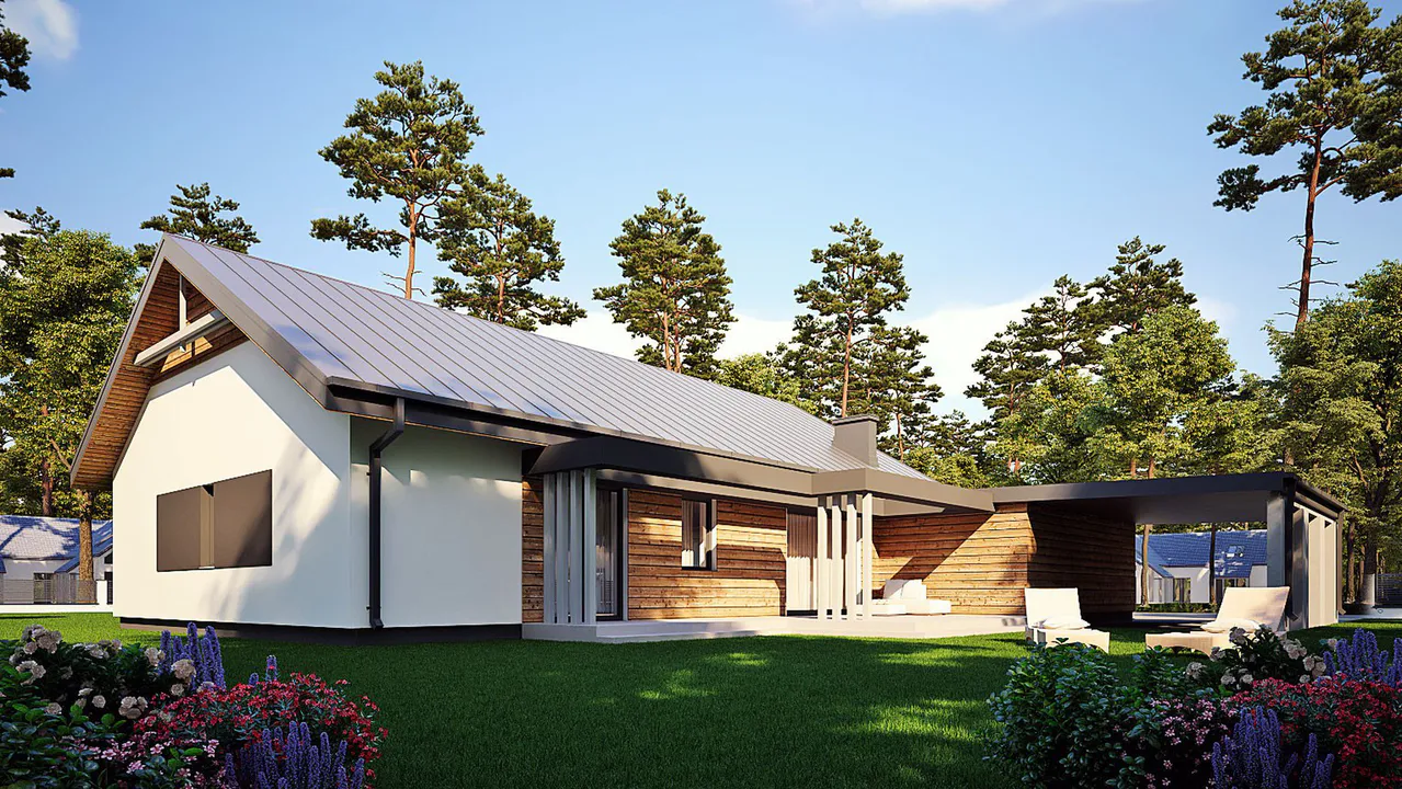 Проект современного одноэтажного дома с террасой, гаражом и навесом.