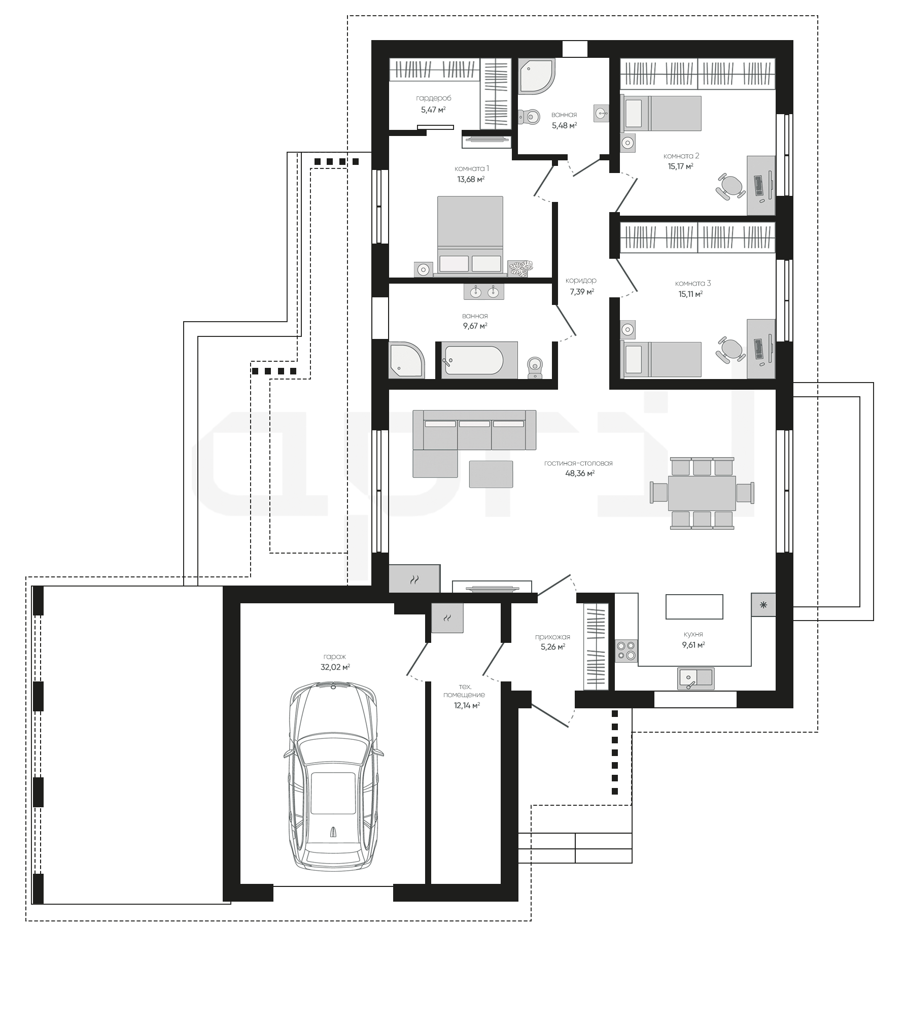 Особенностью, отличающей этот проект от других проектов домов, является дополнительный навес, обеспечивающий крытое парковочное место для второго автомобиля.