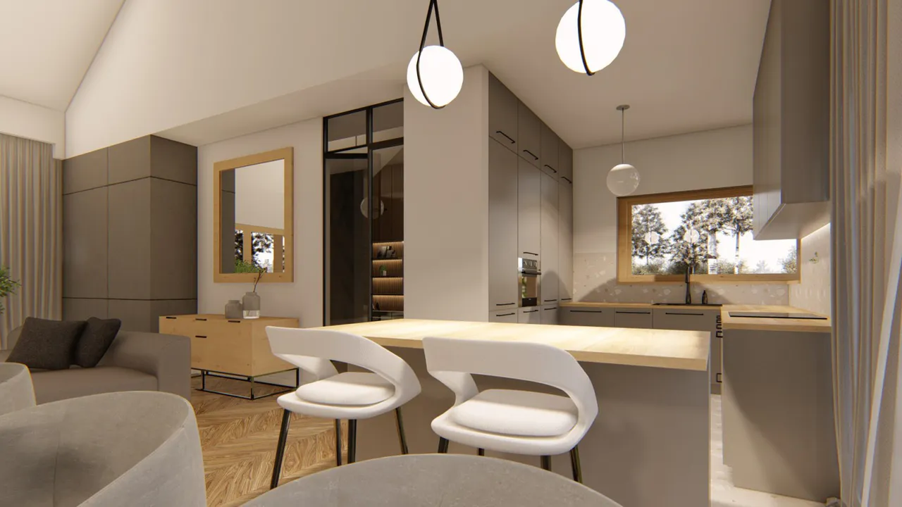 Яркий, освежающий вид дому придали за счет отделки фасада в светлых тонах, с использованием кирпича, штукатурки и натурального дерева.