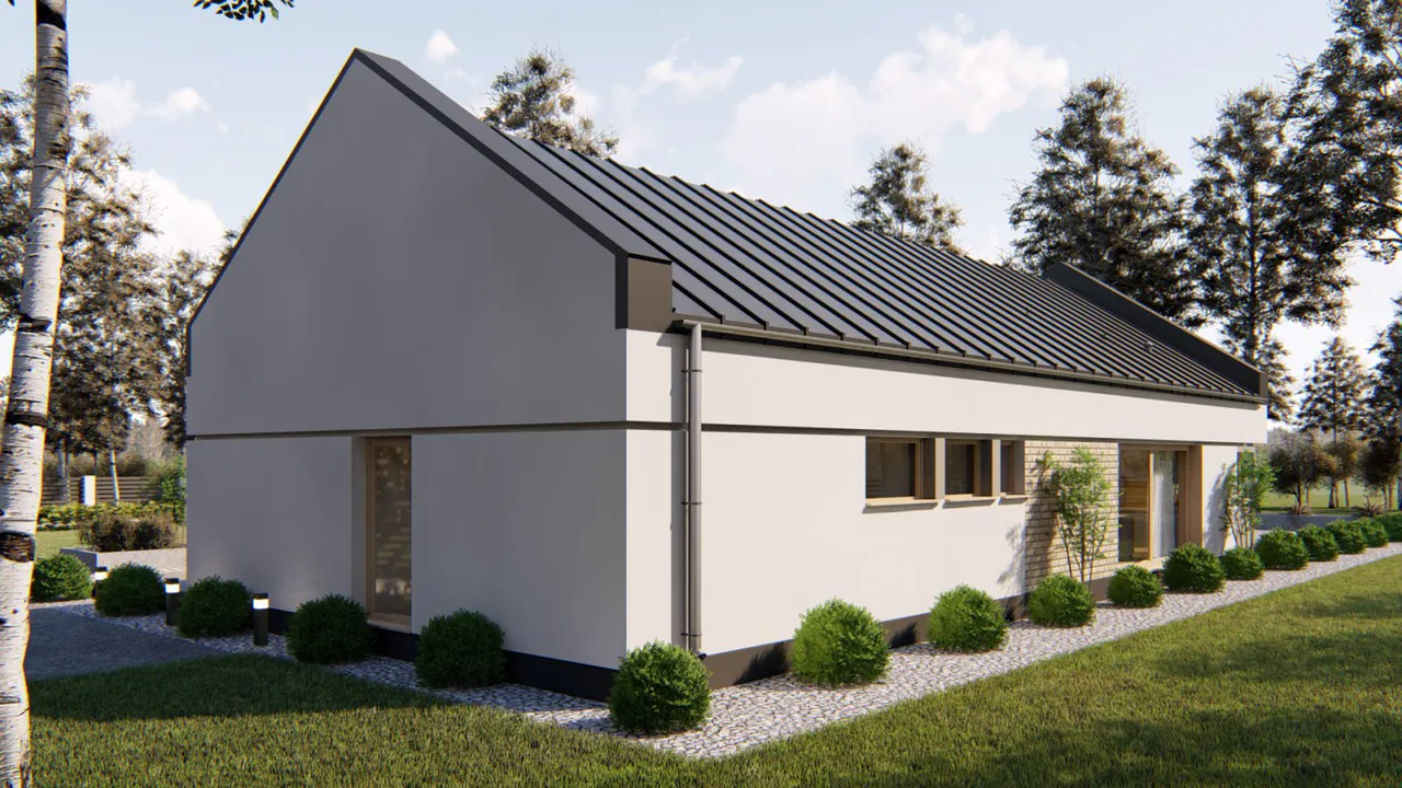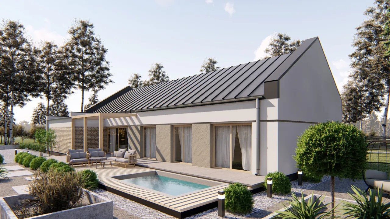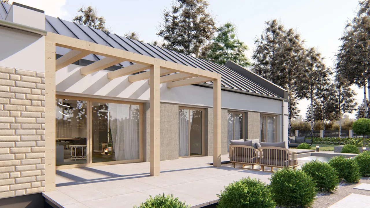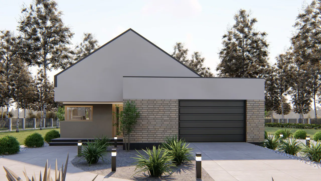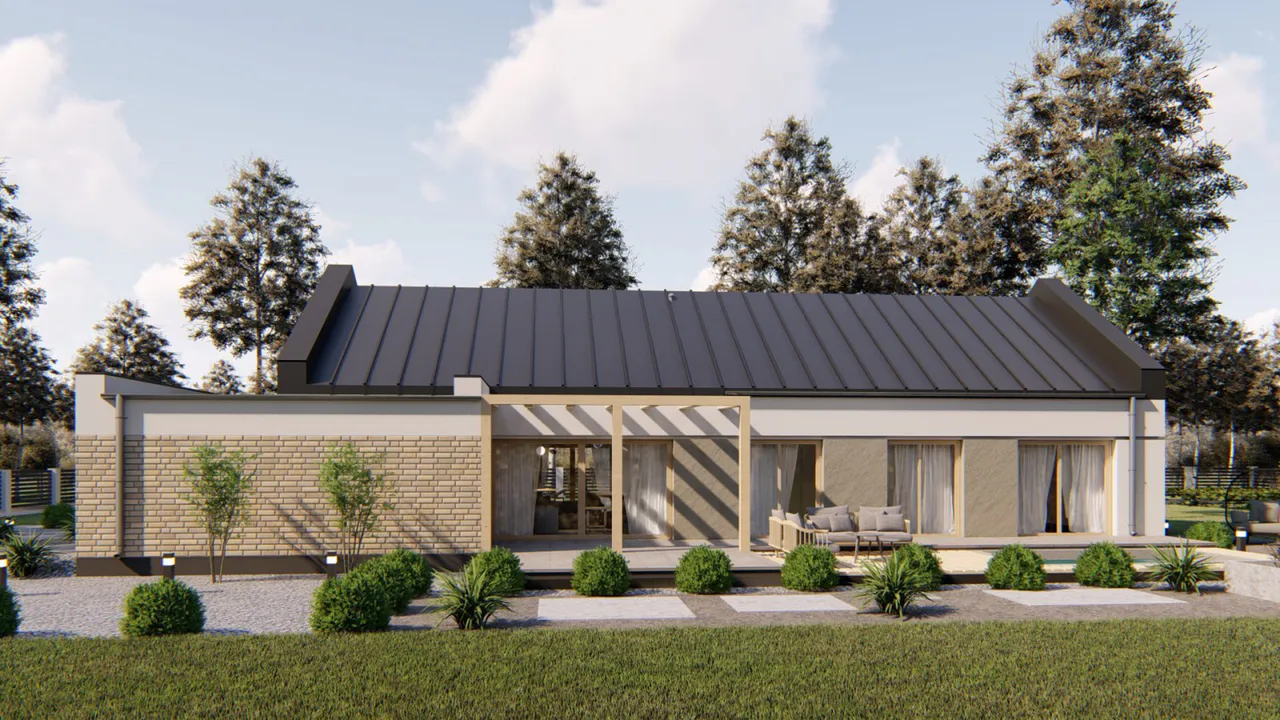 Проект современного одноэтажного дома с гаражом и террасой.