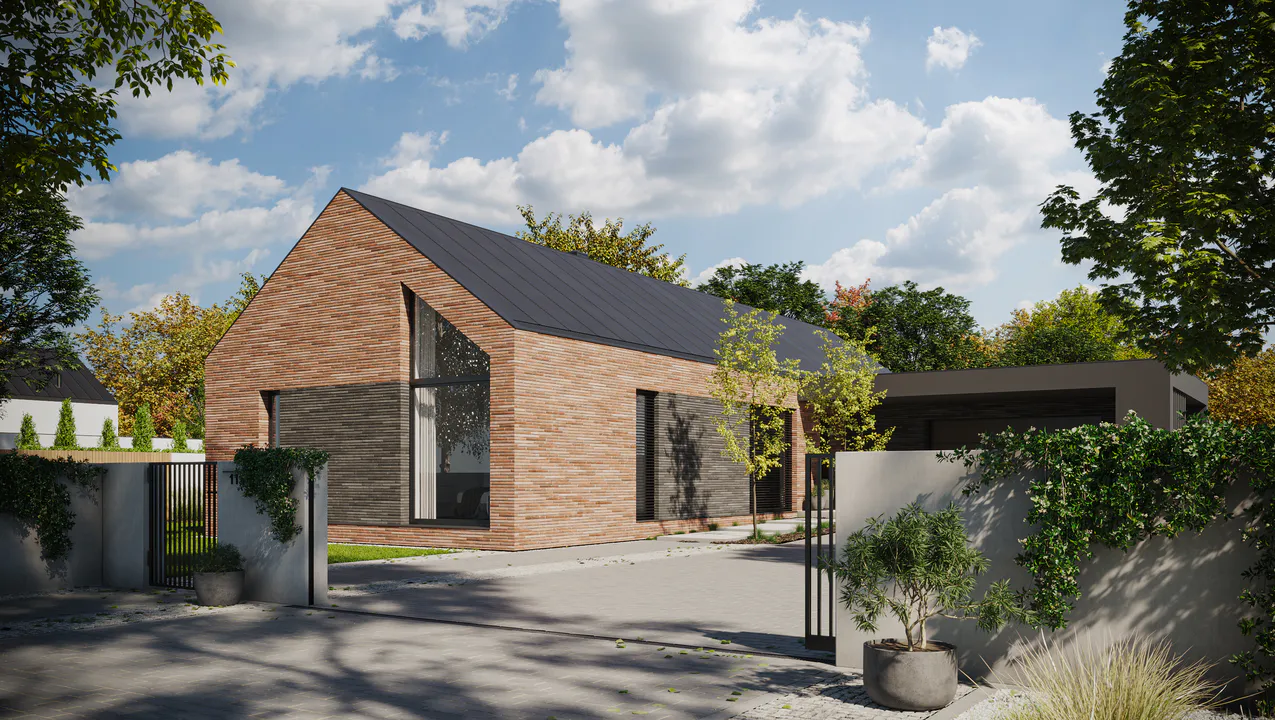 Фасад здания выполнен в бело-темно-сером цвете. Углубления входа и садовой зоны выделены темной штукатуркой и каменными элементами. В передней части дома расположен навес для машины, а пропорции дома дополняет элегантная двускатная крыша, покрытая листовым металлом.