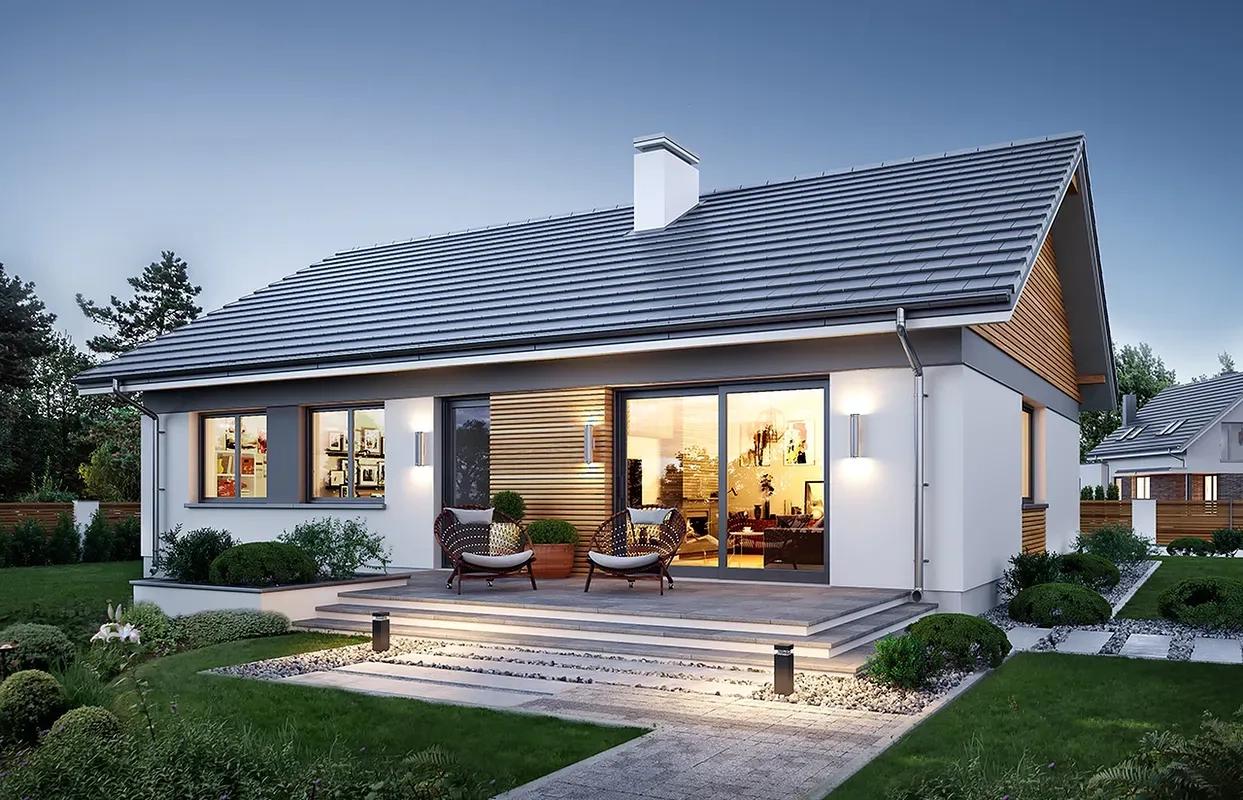 Проект небольшого одноэтажного дома простой формы с двухскатной крышей.