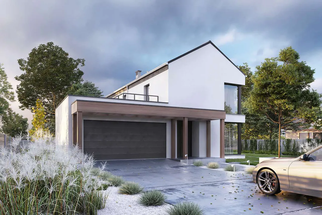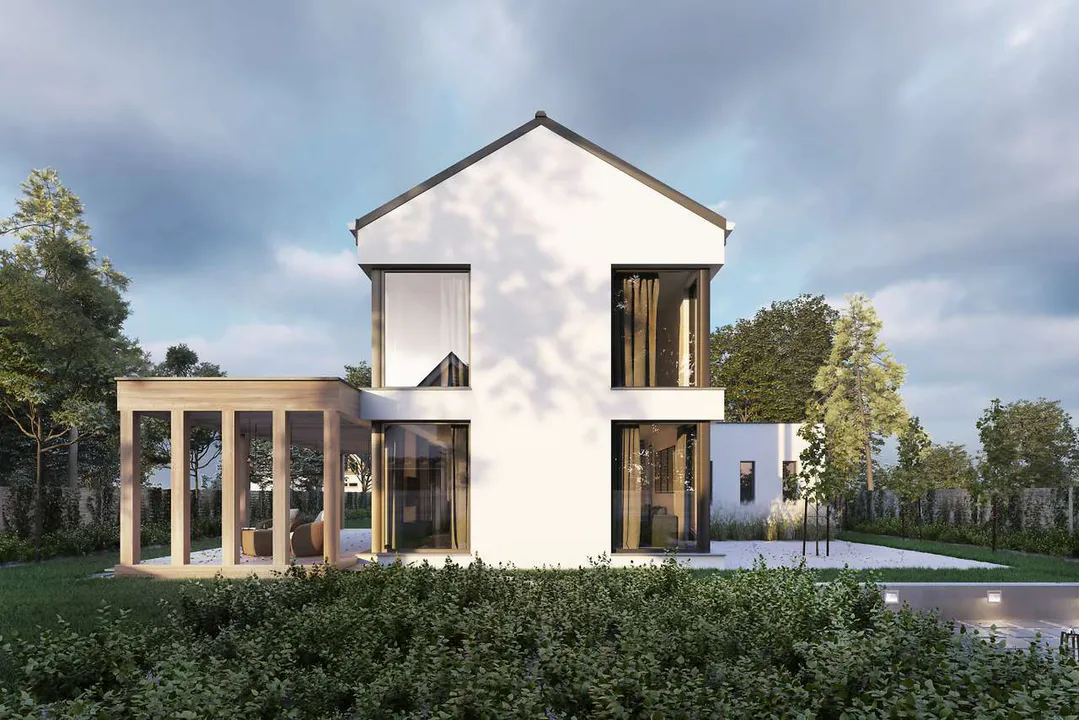 Проект двухэтажного дома с белым фасадом и контрастными черными рамами окон. Крыша двухскатная, также темного цвета. На территории дома имеется просторная терраса под навесом, а также гараж. Архитектура дома минималистичная, с акцентом на четкие линии и крупные окна, что обеспечивает хорошую освещенность помещений.