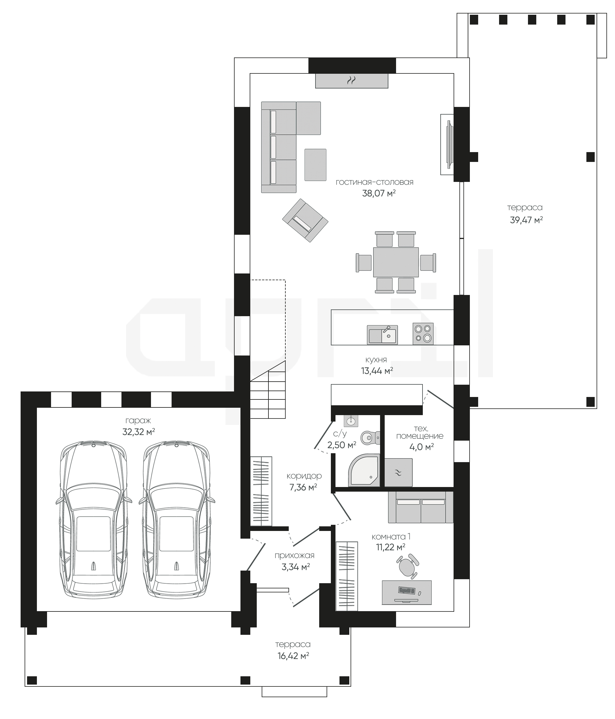 Дома 1 этаж с гаражом и террасой