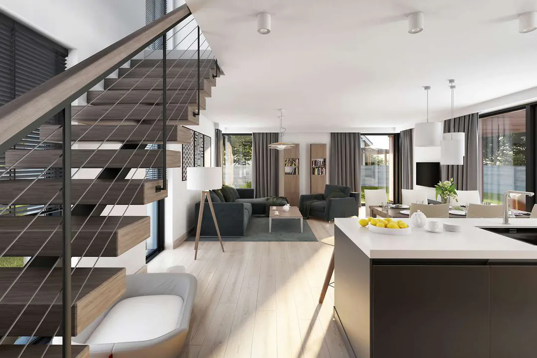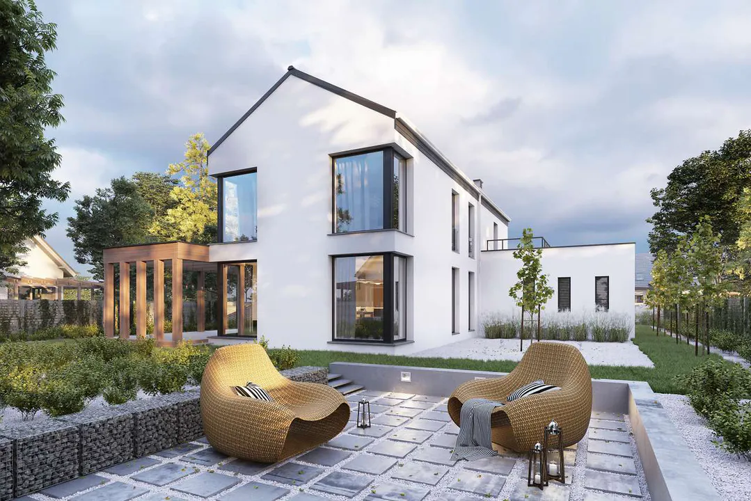 Дом с современным Г-образным корпусом, красивой террасой, затененной деревянным навесом, и функционально спланированным полезным пространством, со встроенным в корпус гаражом на две машины.