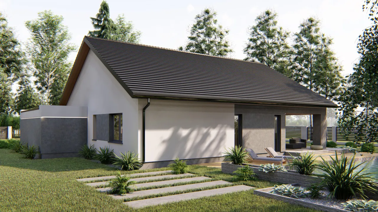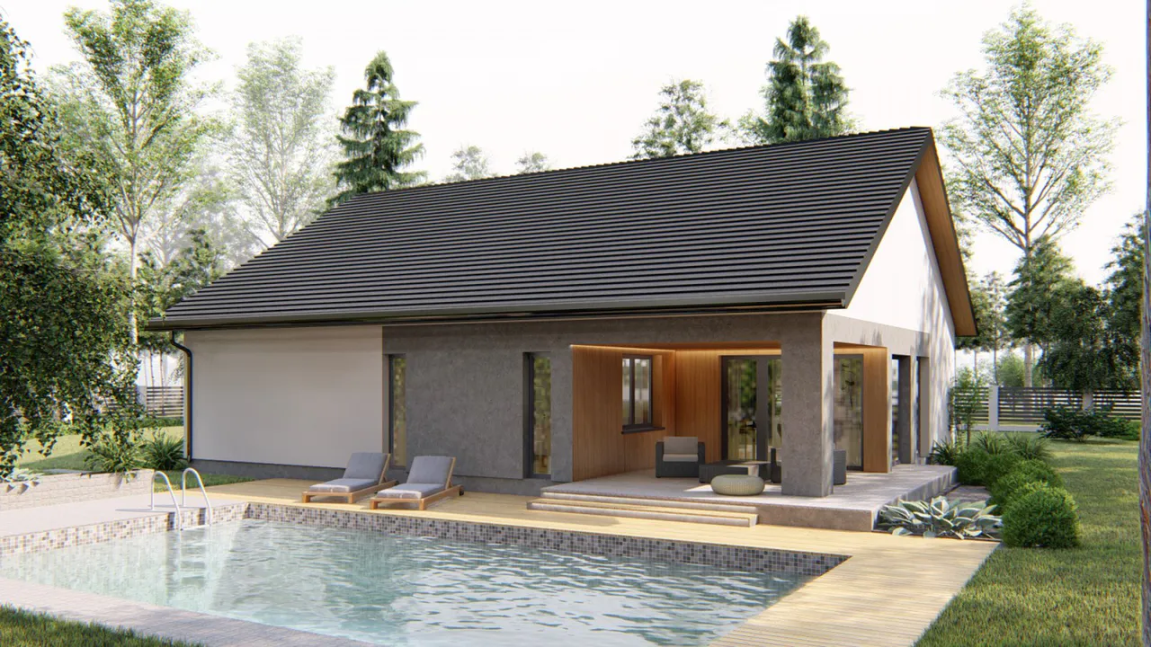 Снаружи форма дома выглядит минималистично и элегантно. Отделочными материалами фасада послужили штукатурка и архитектурный бетон, который сейчас в модном тренде, и сочетающиеся с ним панели под дерево.