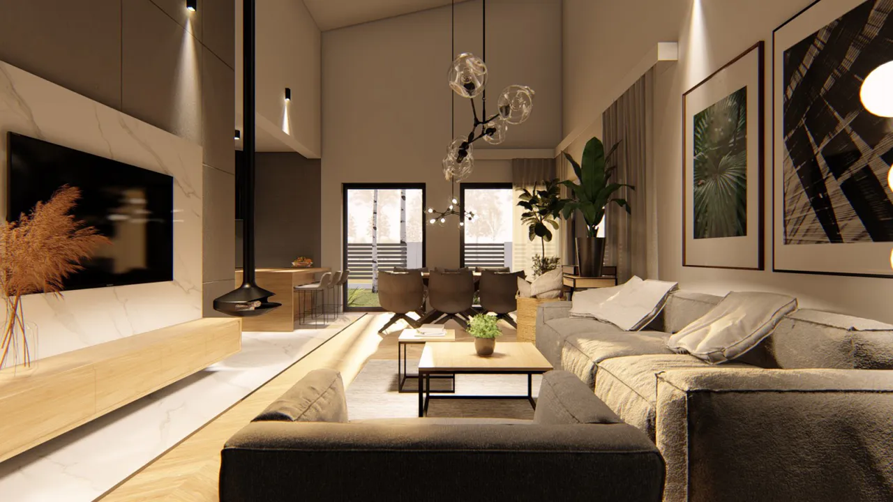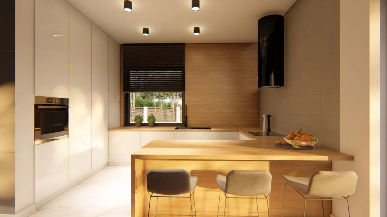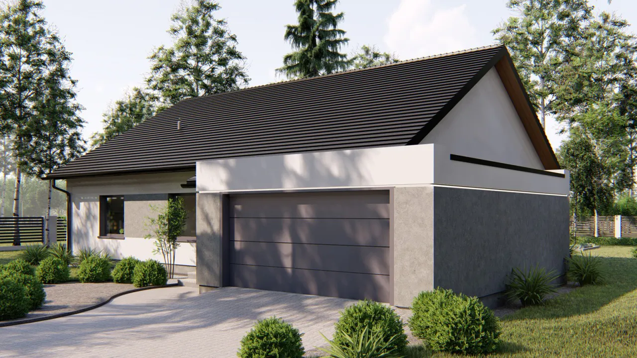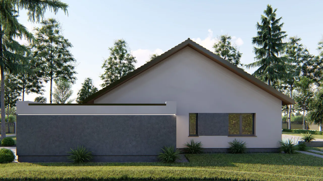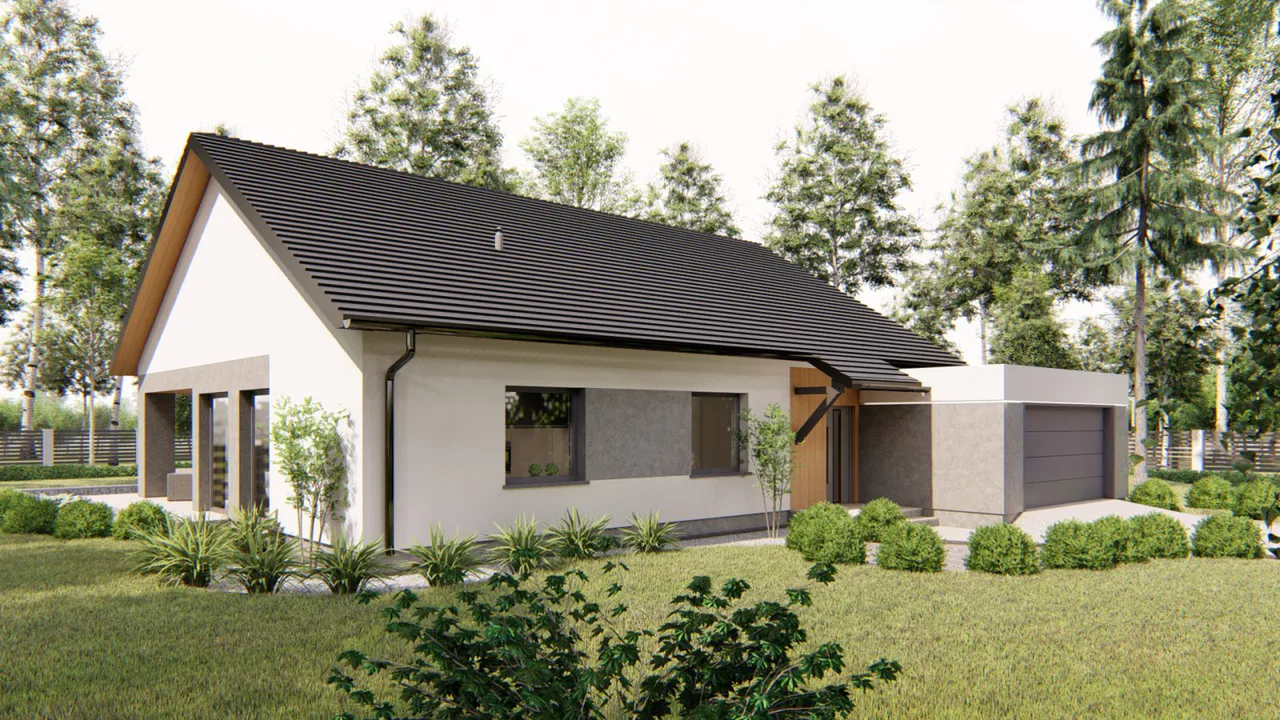 Фасад дома покрыт белой штукатуркой с элементами теплого дерева и архитектурного бетона. Дизайн дома сочетает разные цвета и текстуры материалов за счет этого дом выделяется из других.