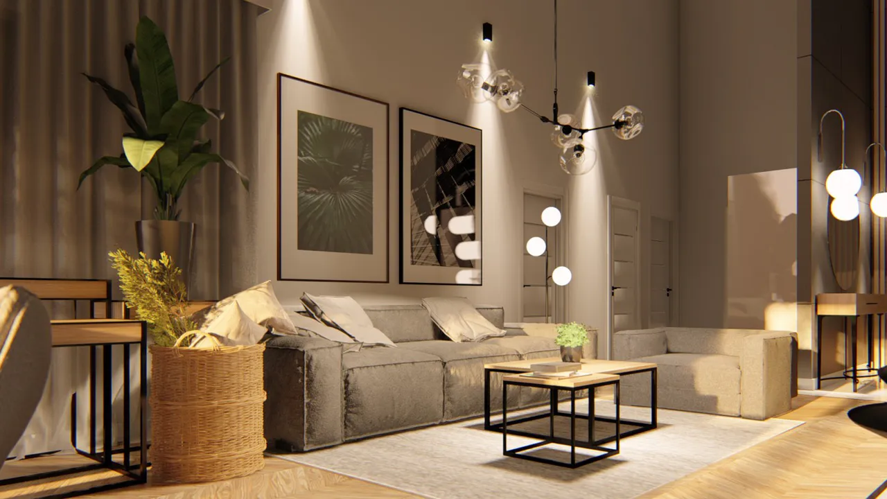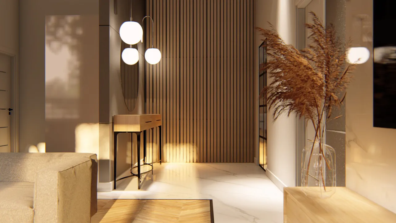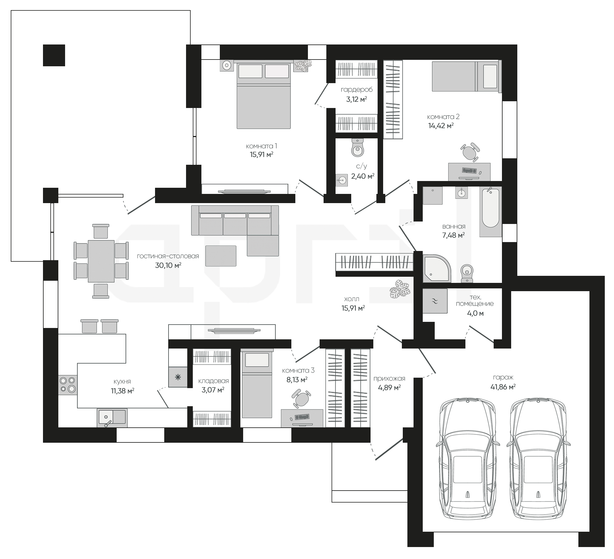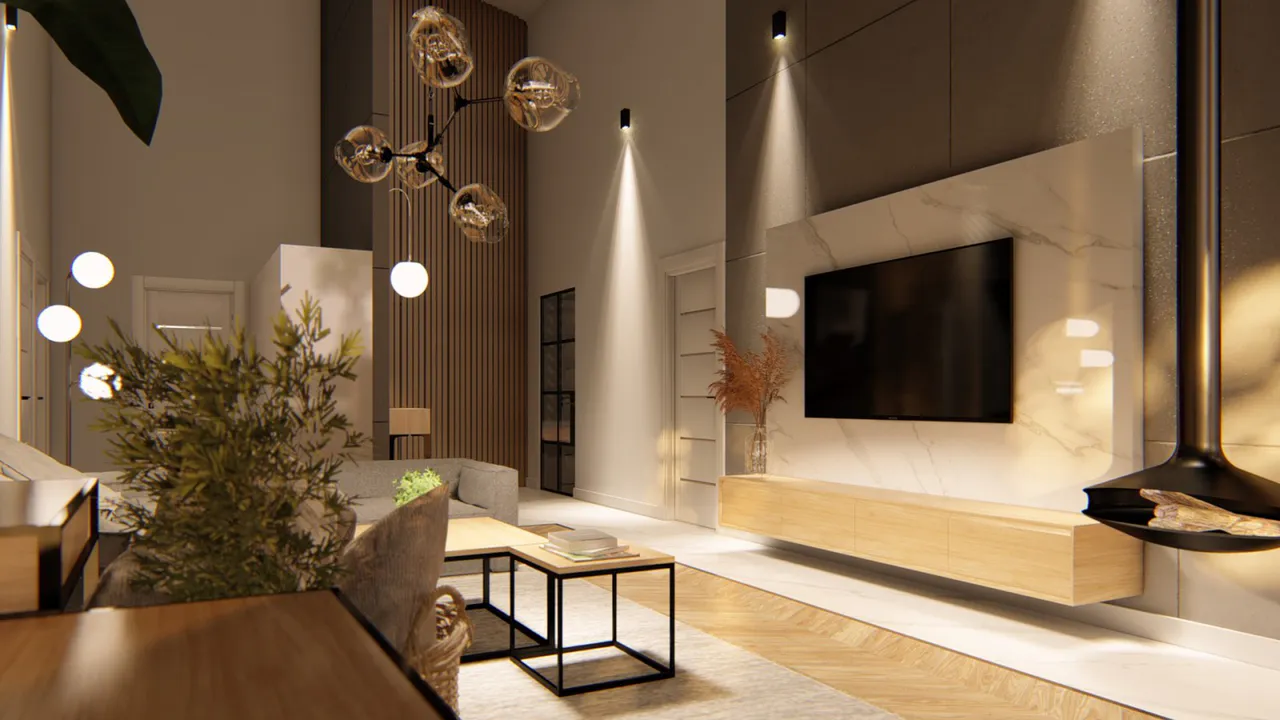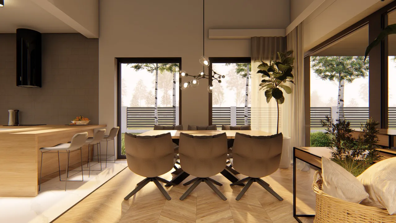 Фасад дома покрыт белой штукатуркой с элементами теплого дерева и архитектурного бетона. Дизайн дома сочетает разные цвета и текстуры материалов за счет этого дом выделяется из других.