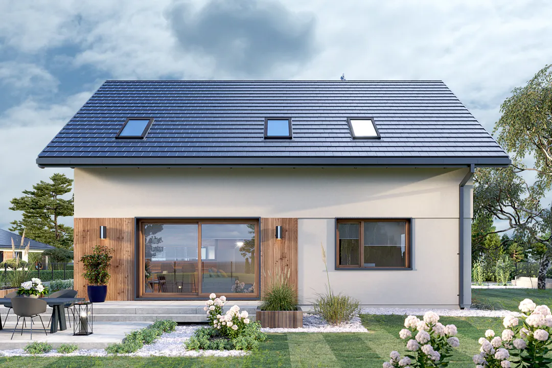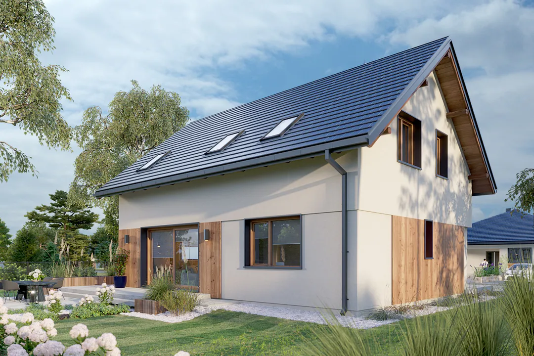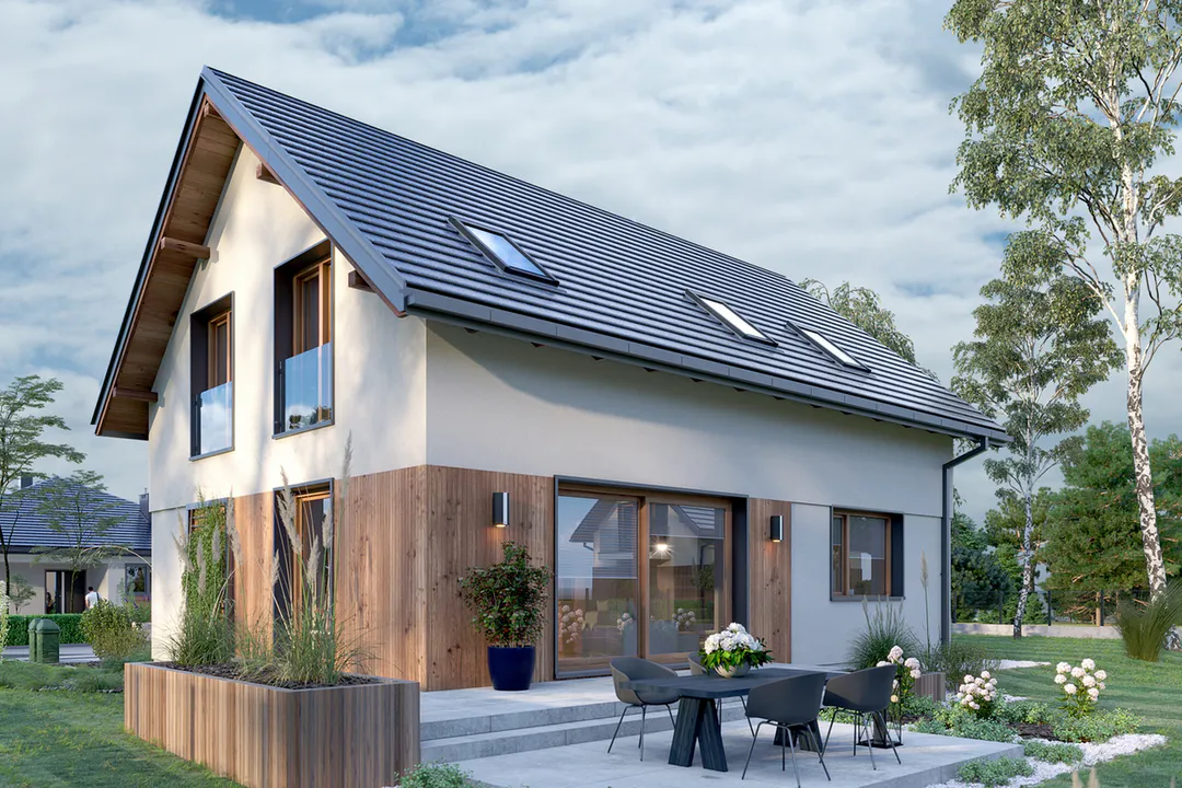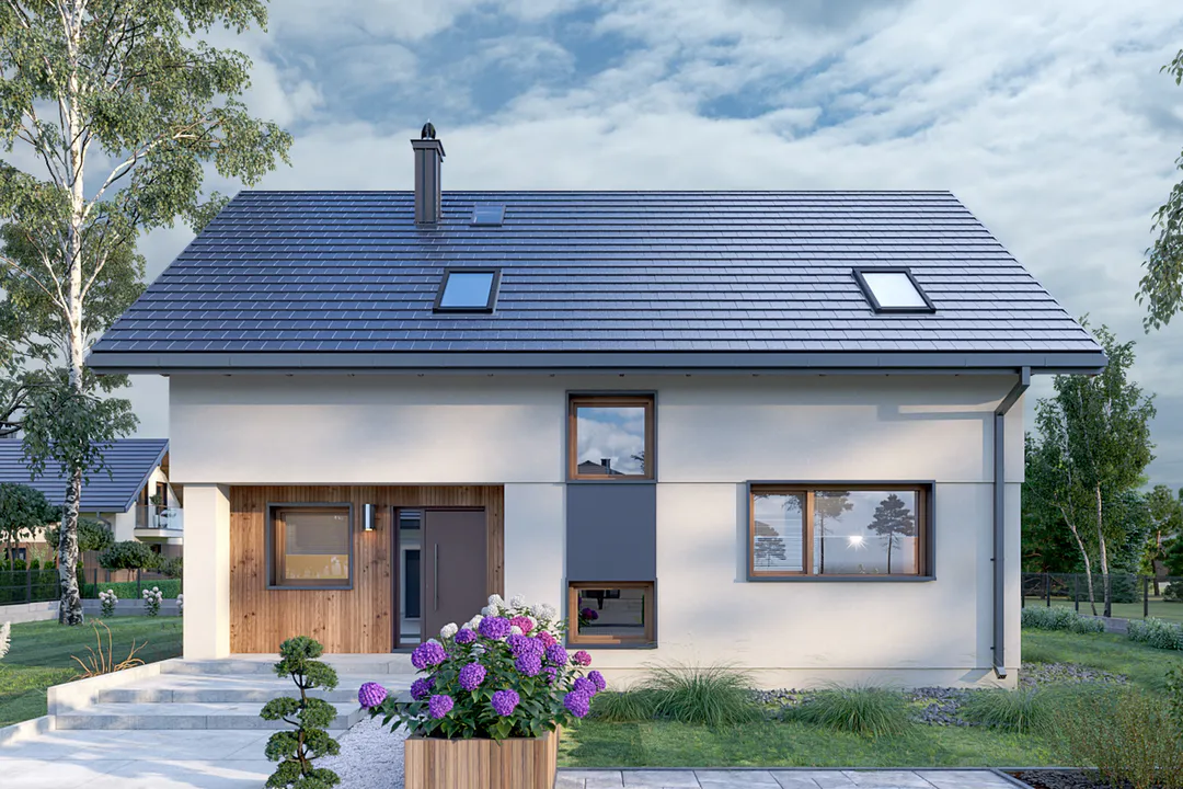 Фасад выполнен в сочетании светлых тонов и деревянных панелей, что придает ему стильный и уютный вид. Дом имеет двускатную крышу темного цвета с несколькими мансардными окнами.