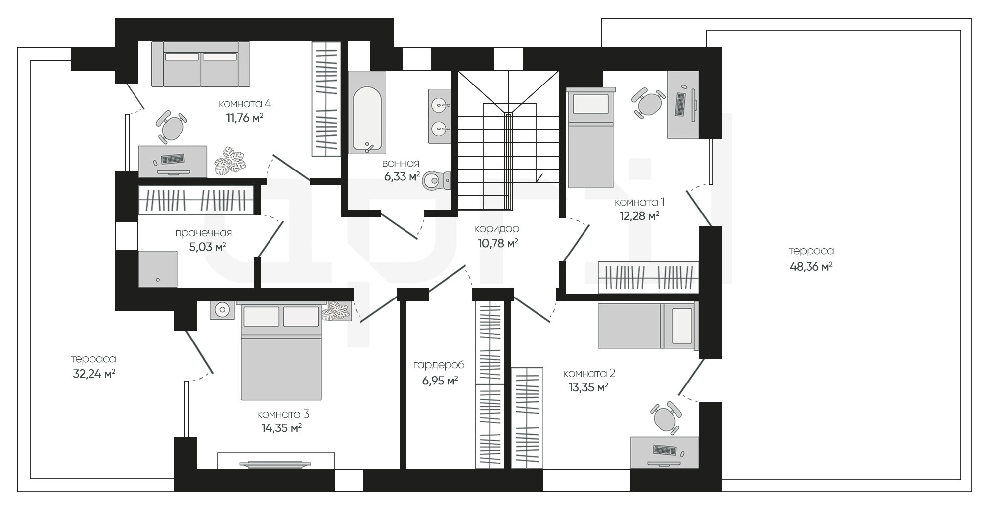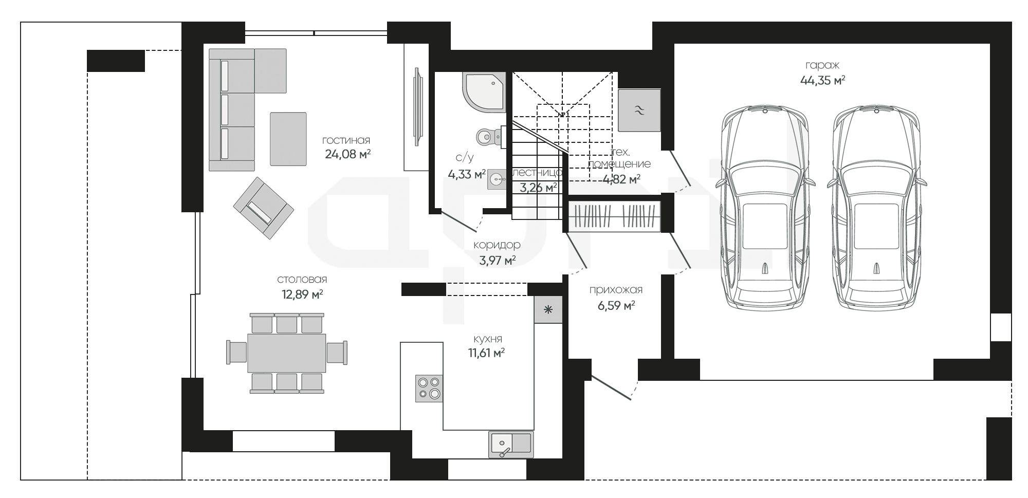 Проект двухэтажного дома с большим гаражом и террасой подходит для людей, ценящих современные тенденции в архитектуре и комфортное жилье.