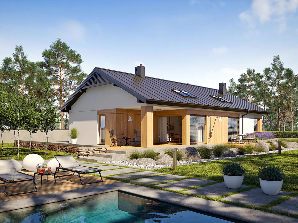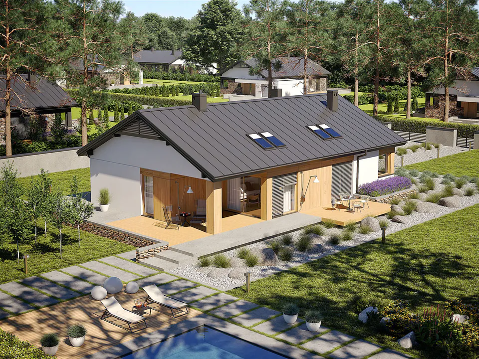 Фасад светлых естественных цветов и простой формы соответствует современным тенденциям. Большим преимуществом конструкции является предусмотренная архитектором двускатная крыша, покрытая листовым металлом.