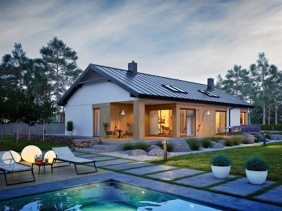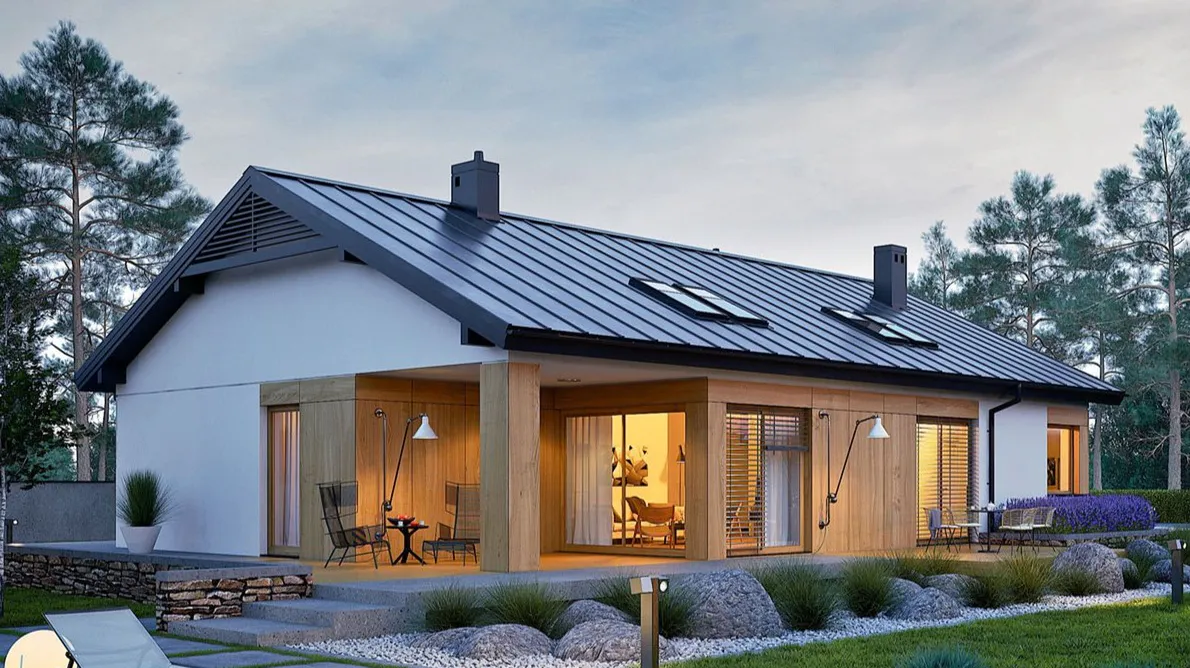 Проект одноэтажного современного дома с гаражом и террасой.