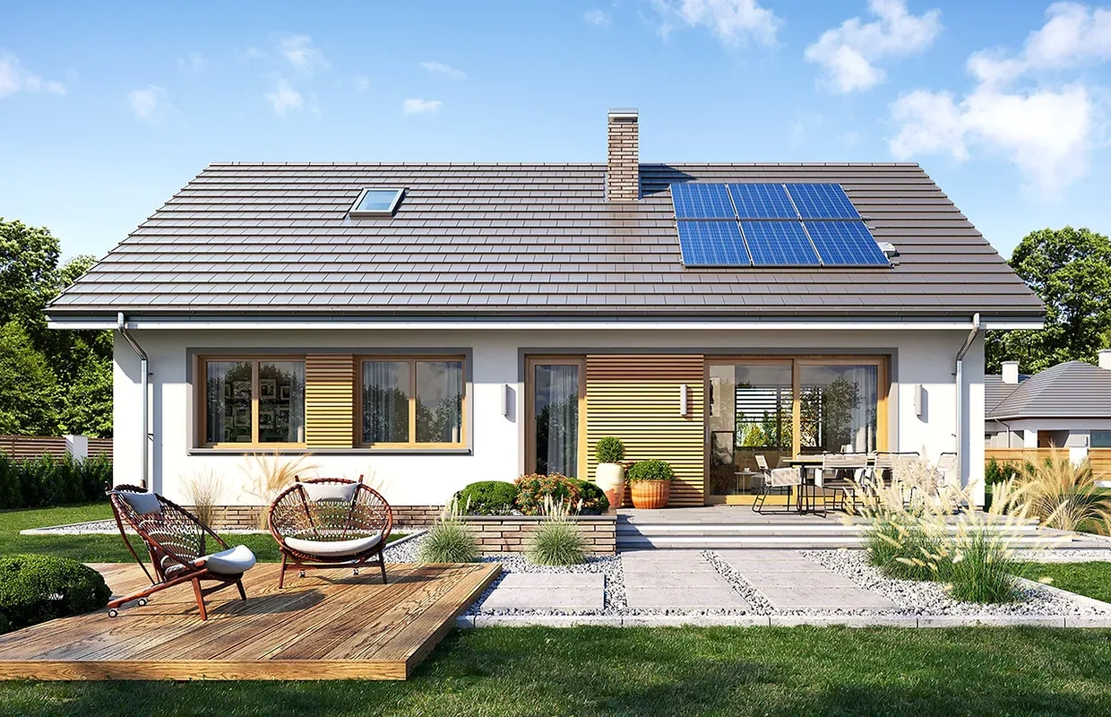 Одноэтажный дом простой формы с двухскатной крышей и террасой.