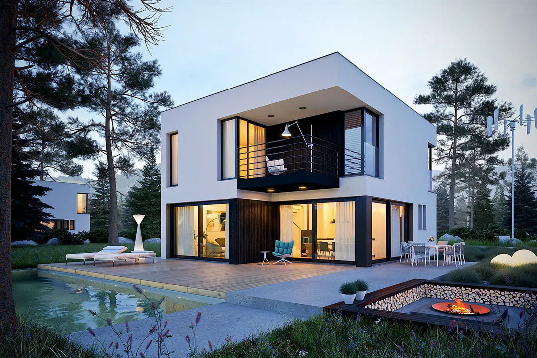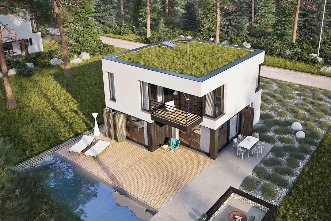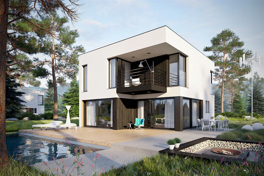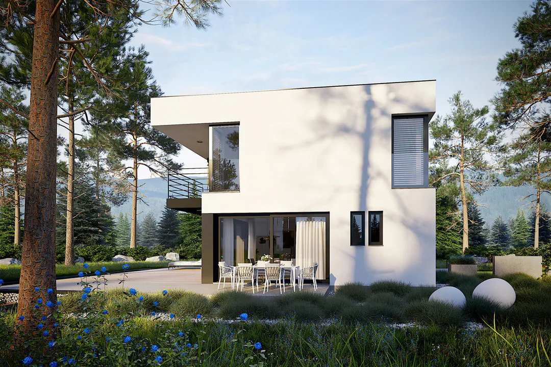 Проект двухэтажного дома в современном стиле Хайтек с большой террасой.
