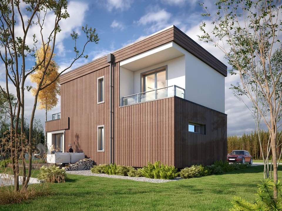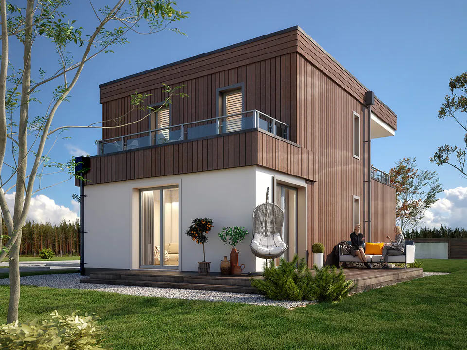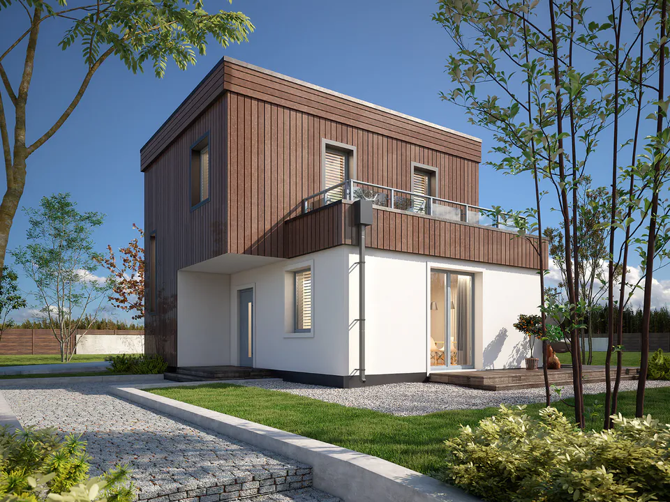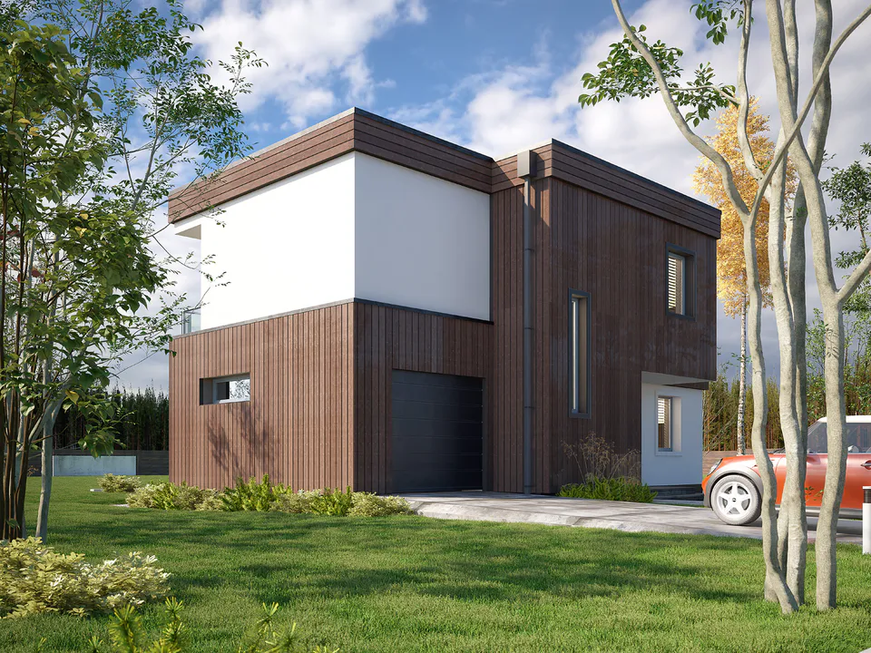 Современный проект двухэтажного дома, который выделяется своей современной формой с плоской крышей и эффектно отделанным фасадом.