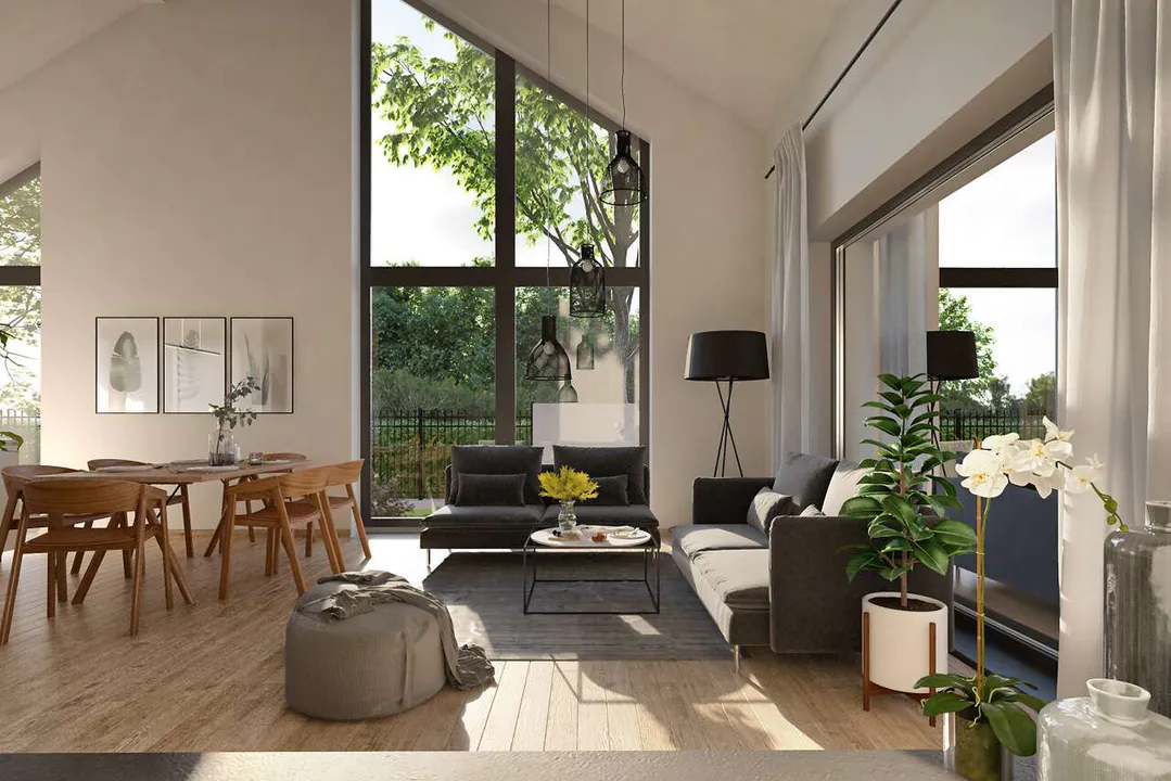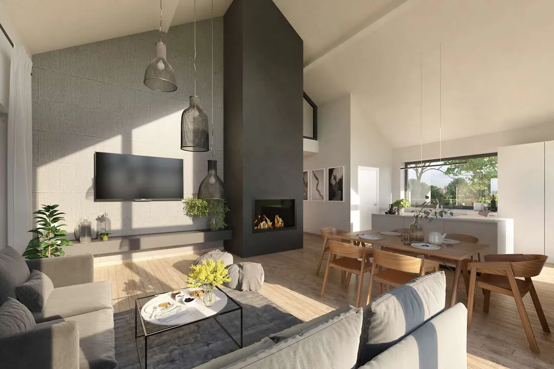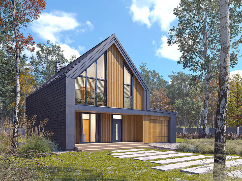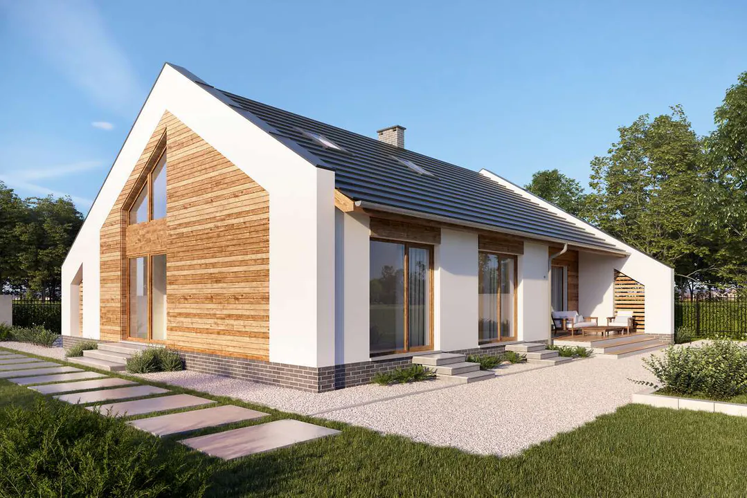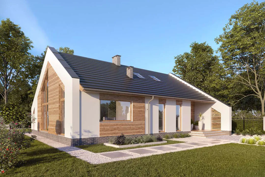 Фасад выполнен в сочетании белого цвета и отделки под дерево, что придаёт дому стильный и элегантный вид. Дом имеет большие окна, обеспечивающие хорошее естественное освещение.
