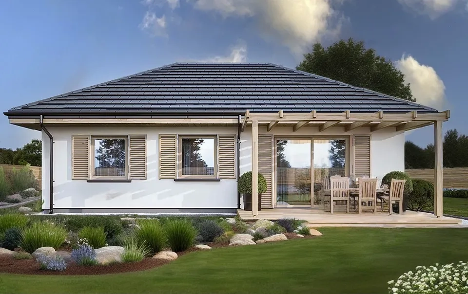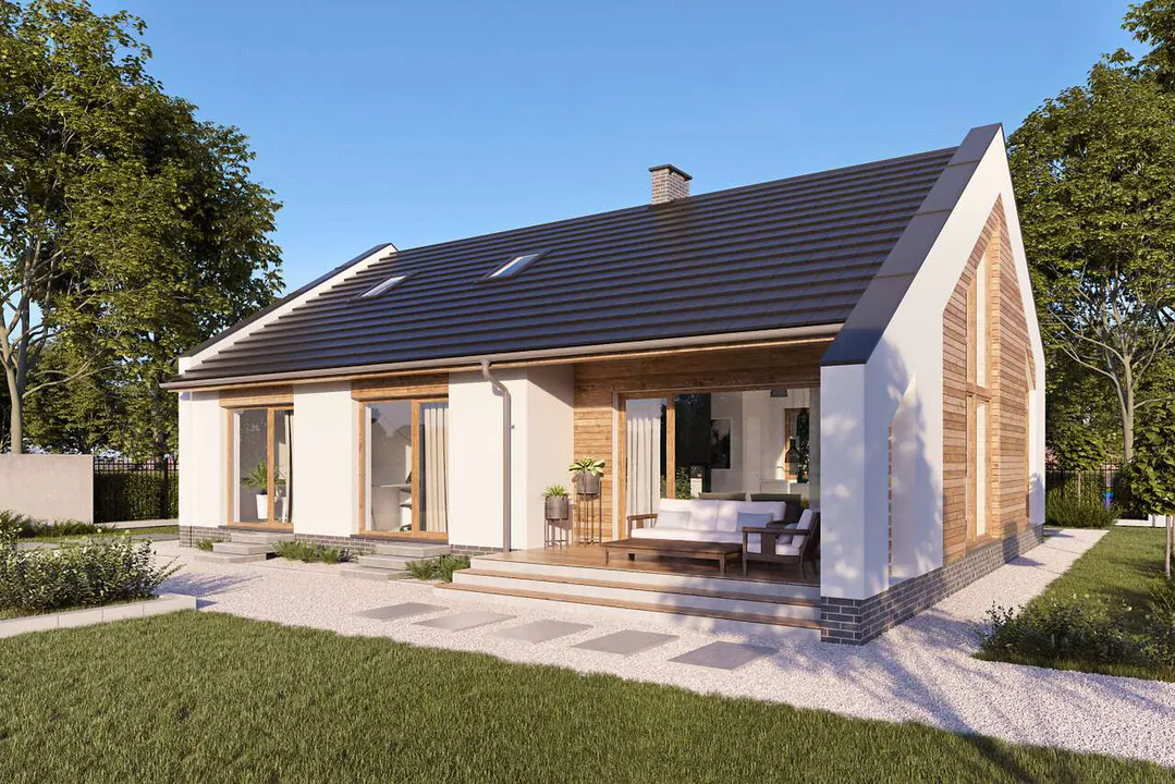 Небольшой одноэтажный дом привлечет внимание своим уникальным внешним видом, который характеризуется удлиненными фронтонами и функциональной планировкой интерьера.