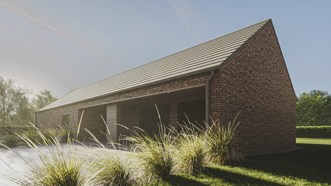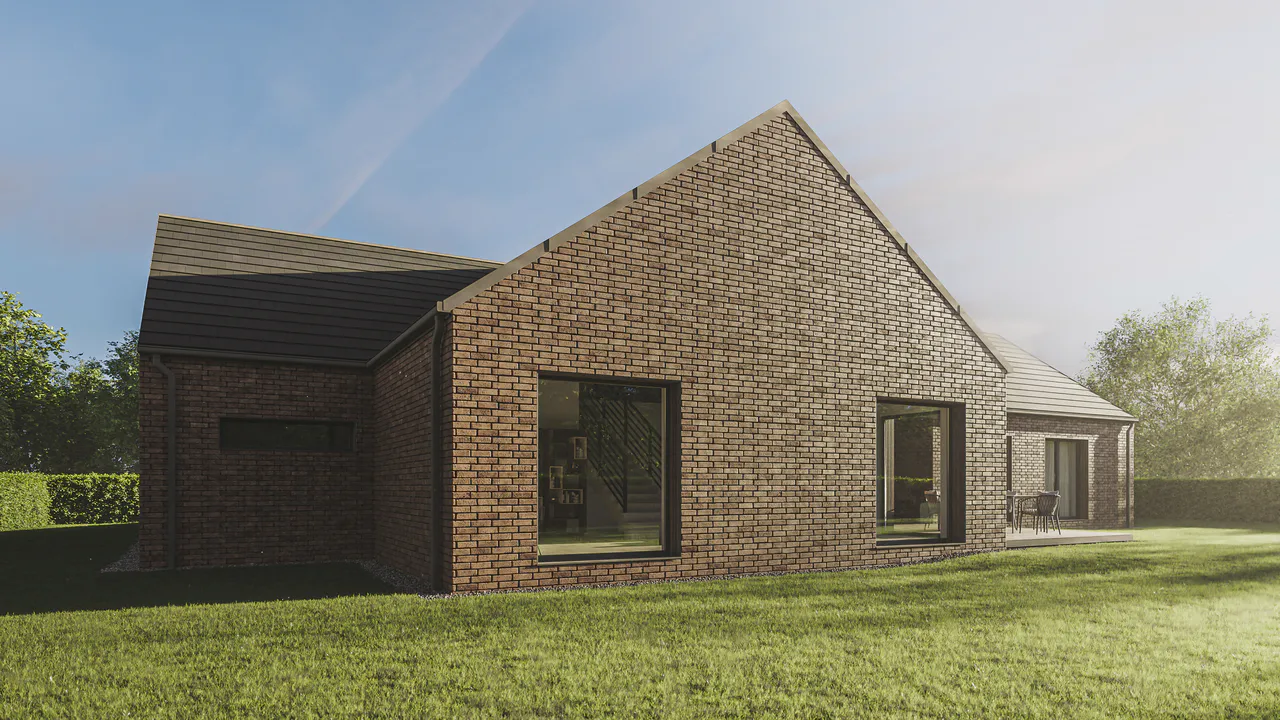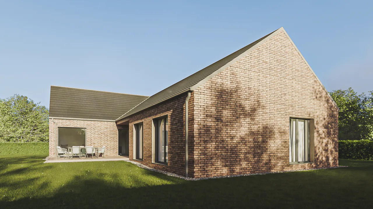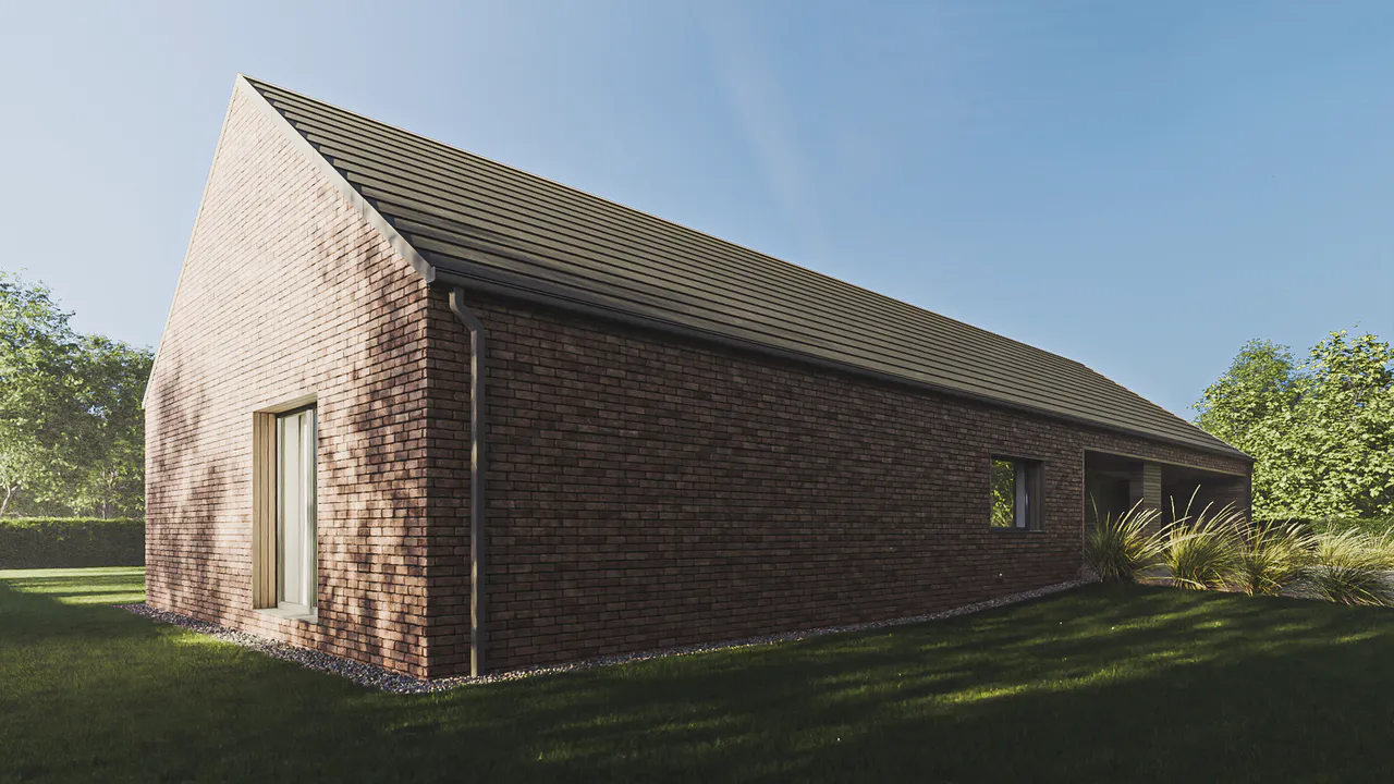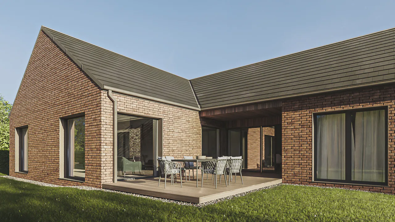Дом одноэтажный и имеет классическую двускатную крышу, покрытую темной черепицей. Форму дома подчеркивает единый внешний материал фасада коричневый кирпич.
