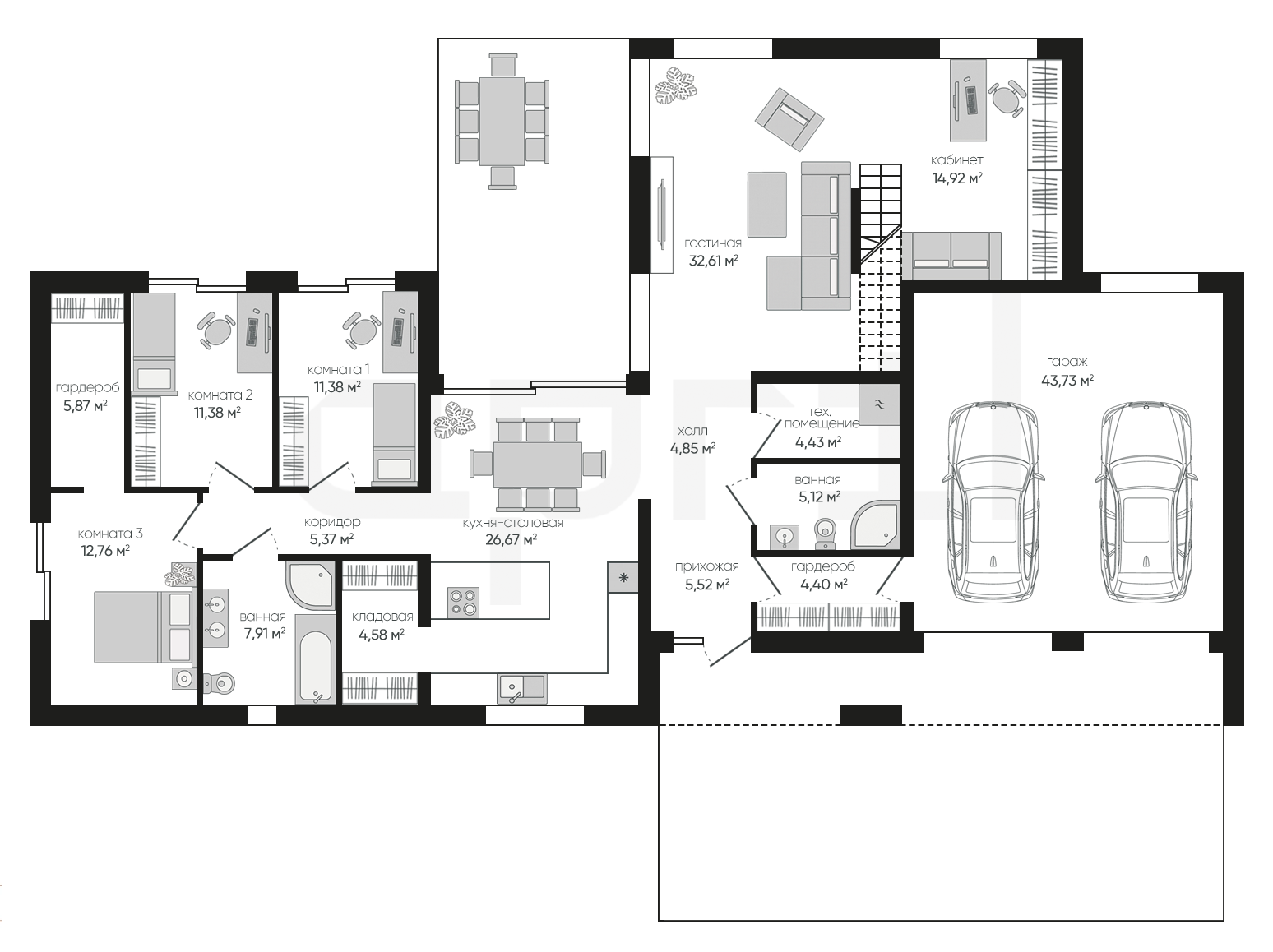 Характерной особенностью является Г-образная форма, позволяющая легко разделить помещения на зоны. Интересно оформленная антресоль с чердаком и терраса создают дополнительное пространство. которое придется по вкусу сторонникам современных решений.