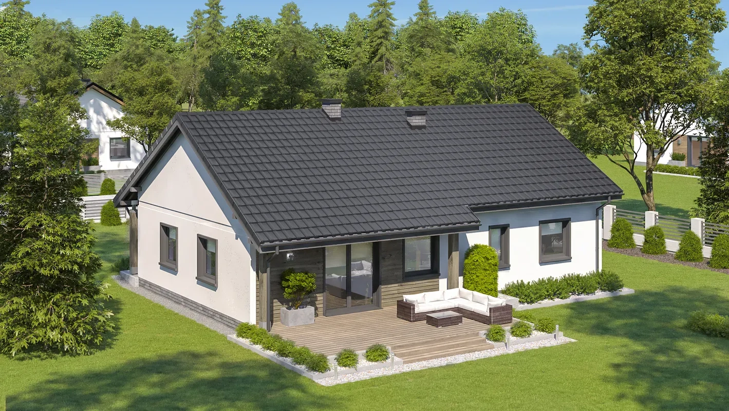 Проект одноэтажного дома с двухскатной крышей и террасой.