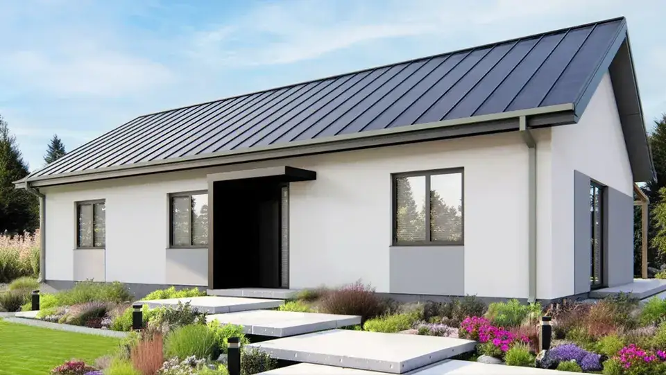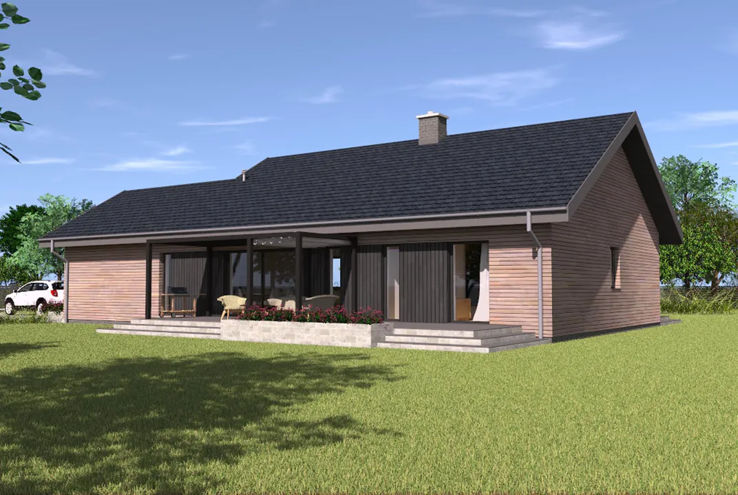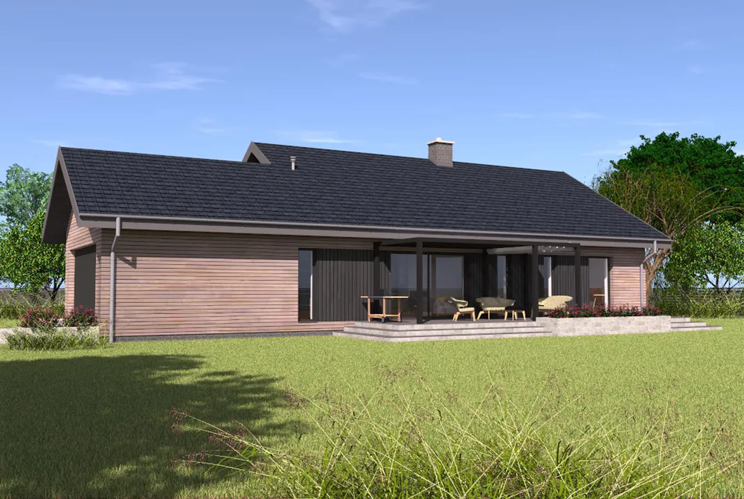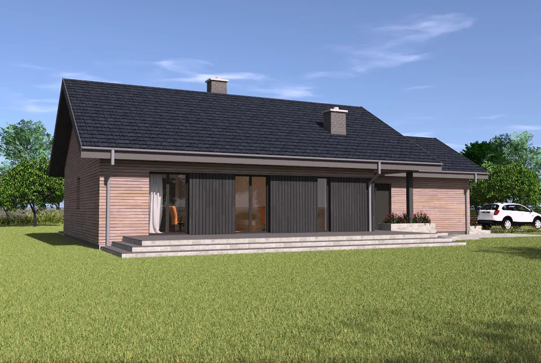 Дом спроектирован в современном стиле с акцентом на простоту и функциональность.
