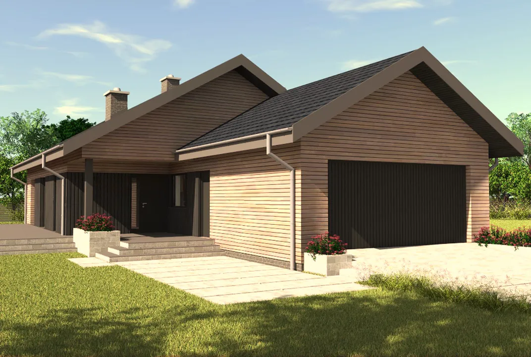Спереди выступает большой гараж с двускатной крышей, покрытой черной керамической черепицей как и остальная часть дома.