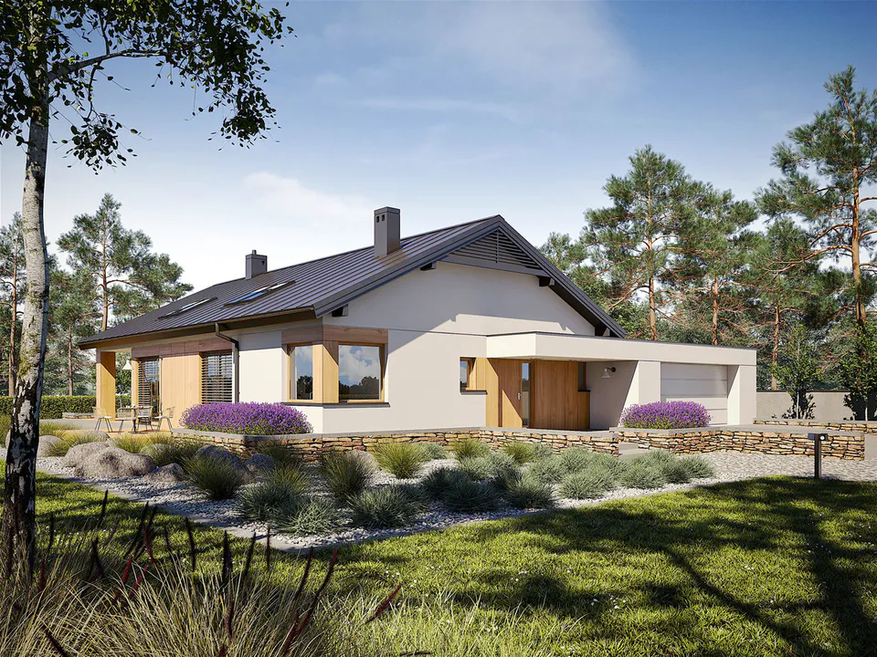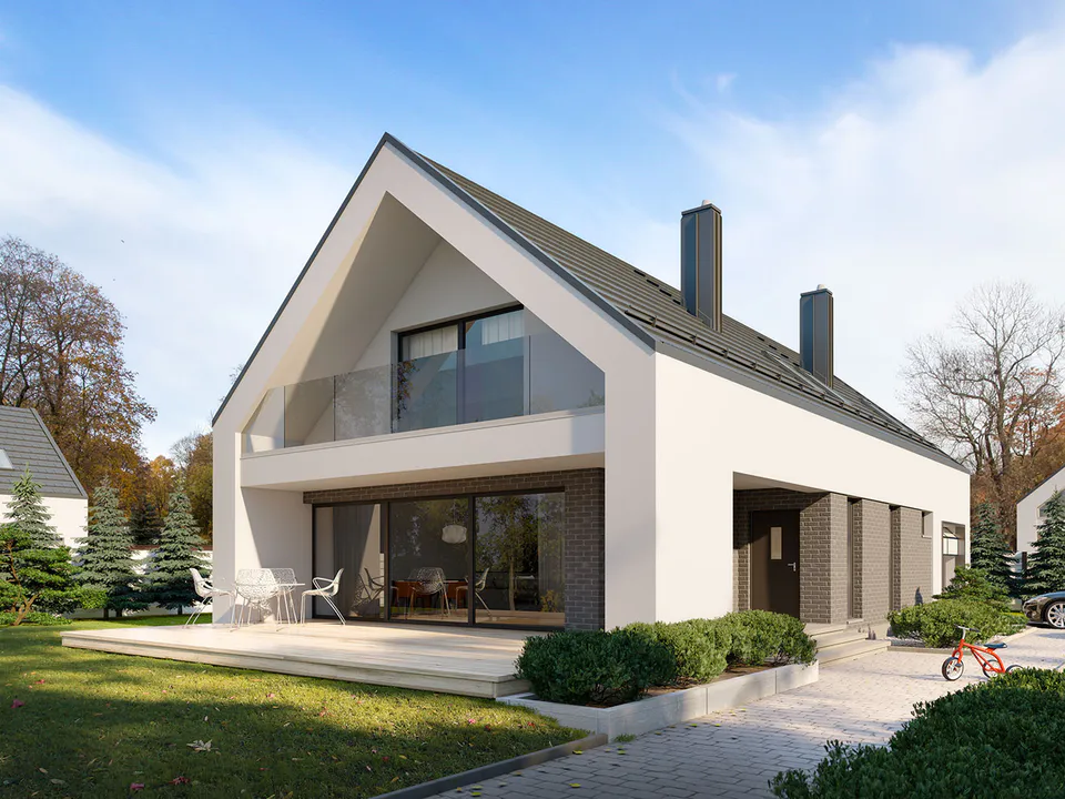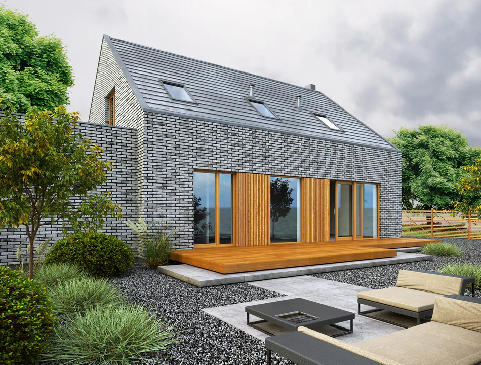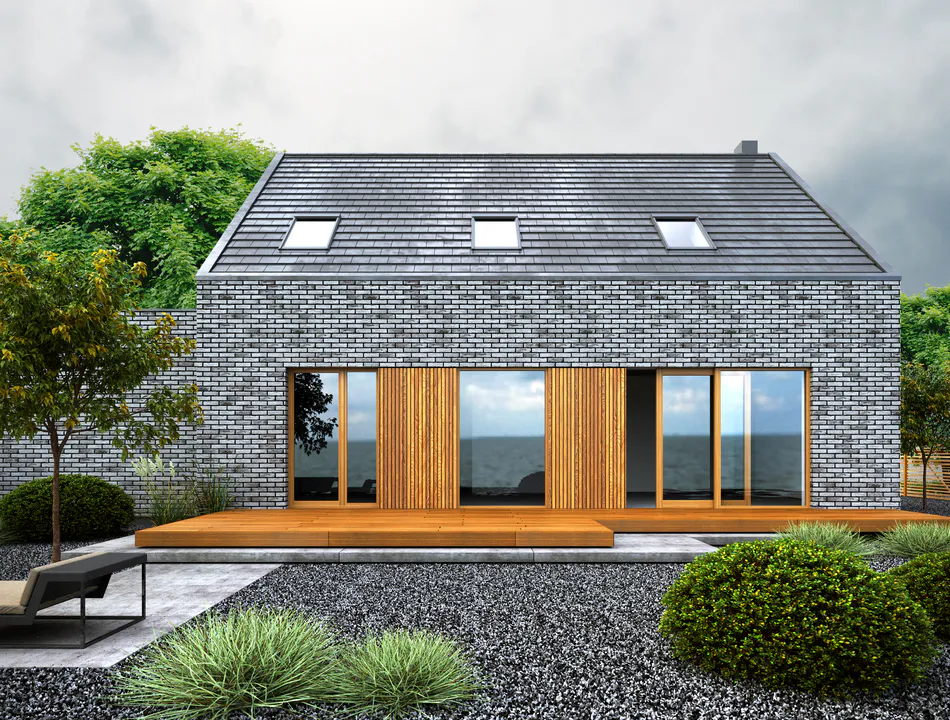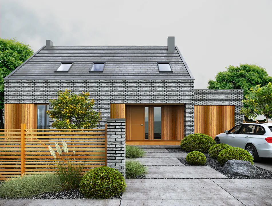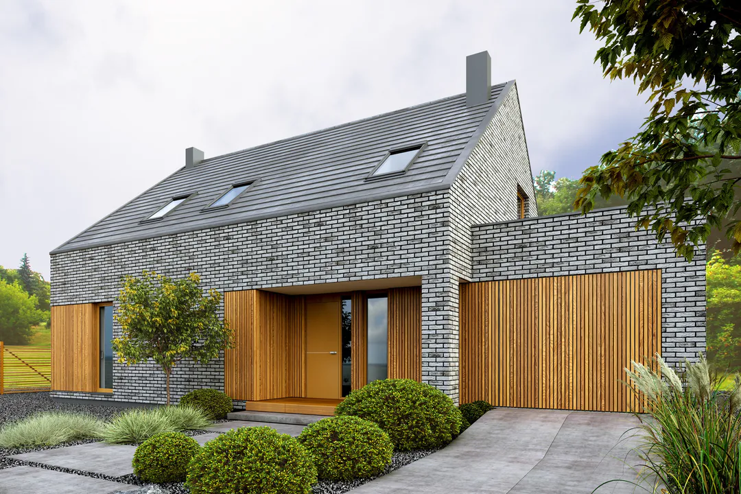Фасад покрыт серым облицовочным кирпичом, который придаёт дому сдержанный и элегантный вид. Входная дверь, гаражные ворота и окна украшены вертикальными деревянными панелями, которые добавляют теплоты и контраста облицовке из кирпича. Дом имеет двускатную крышу серого цвета с несколькими мансардными окнами, которые обеспечивают дополнительное естественное освещение.