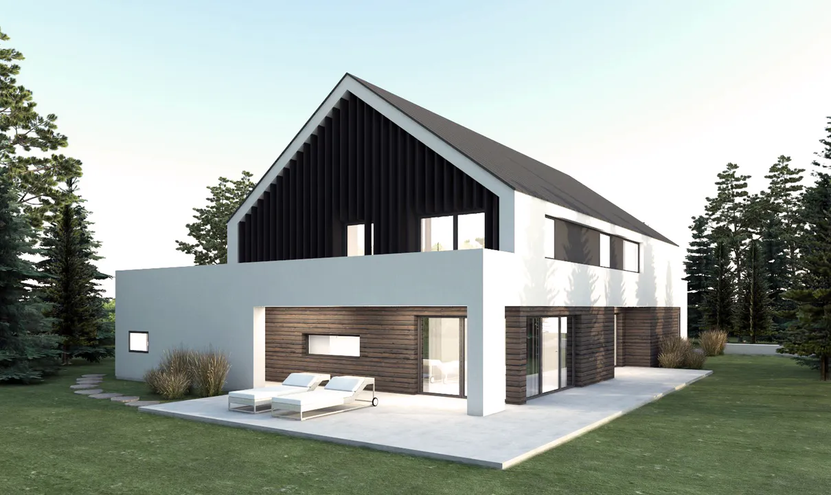 Дом имеет двухскатную крышу тёмного цвета и белые стены с элементами темного дерева, что добавляет интересный контраст. Большие окна на фасаде добавляют современности и создают светлую и открытую атмосферу внутри дома.