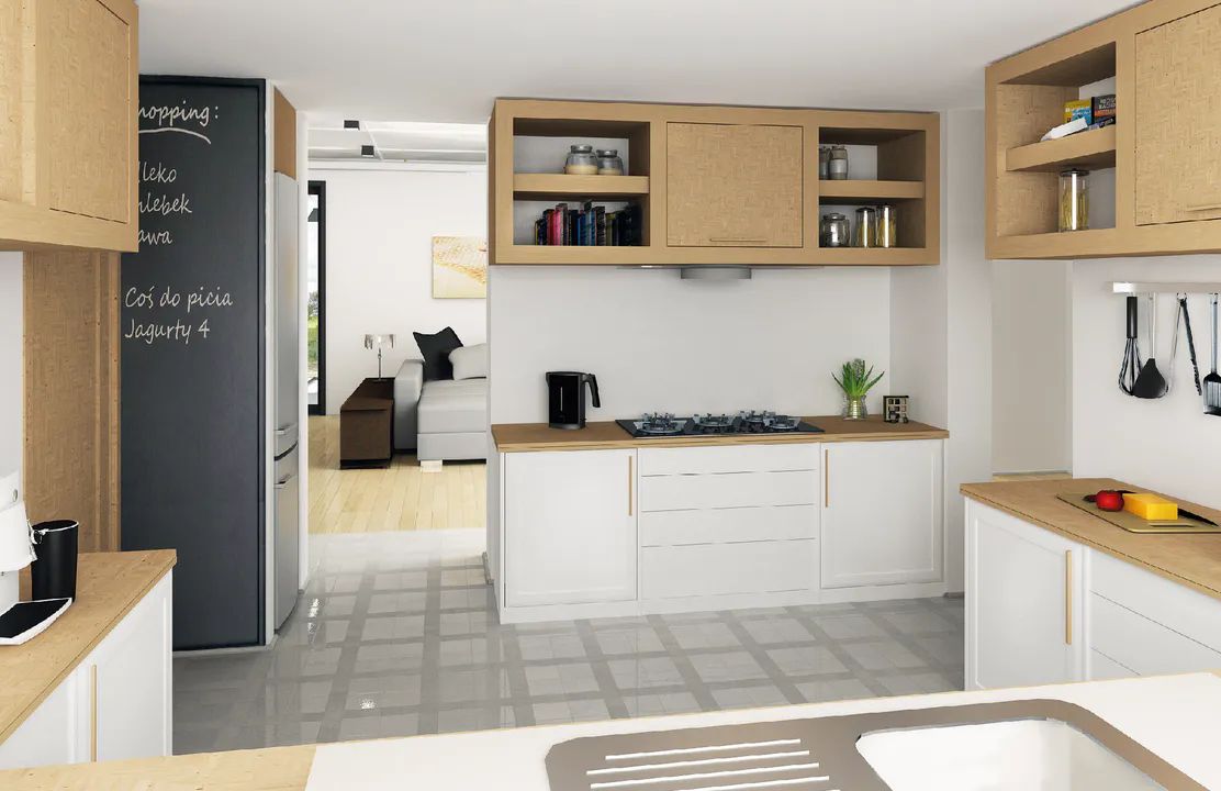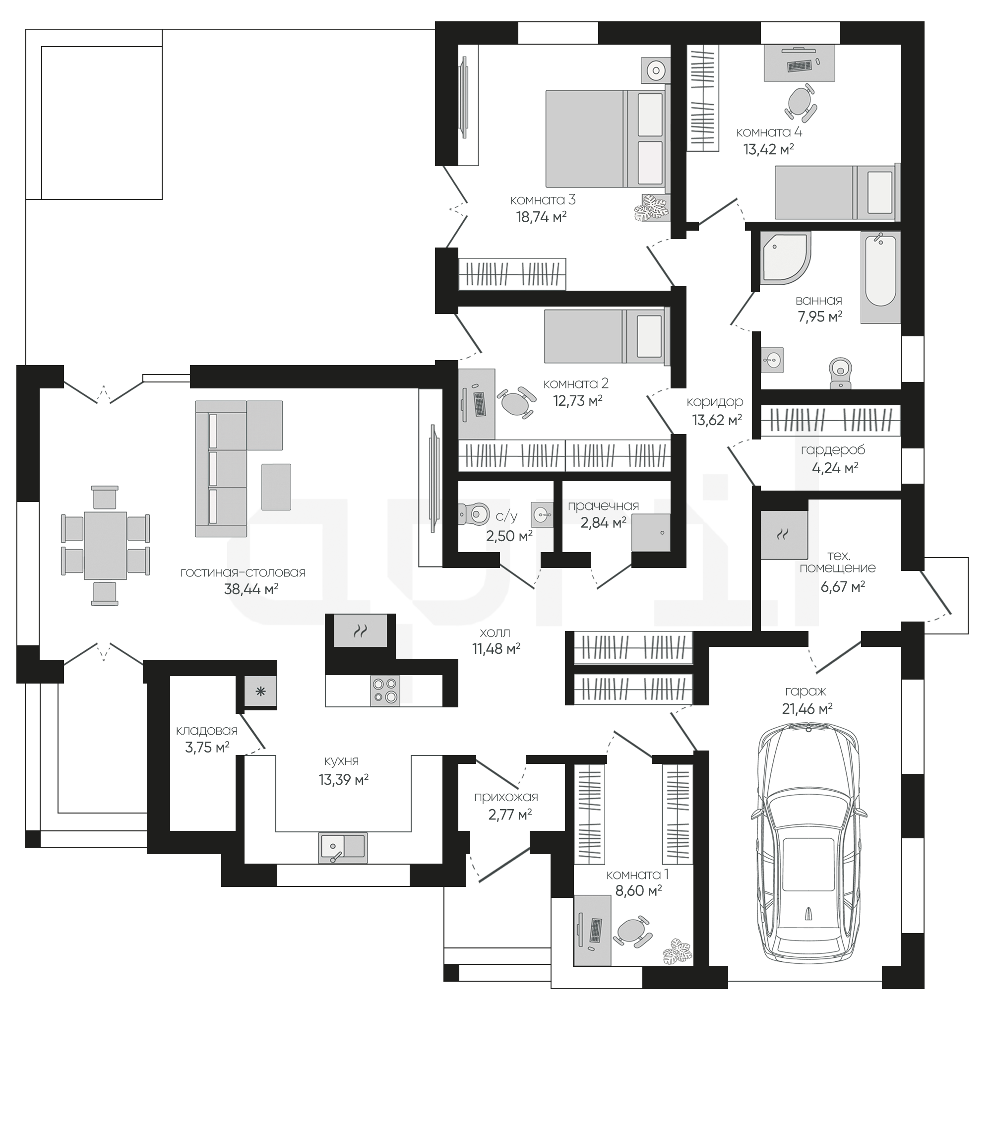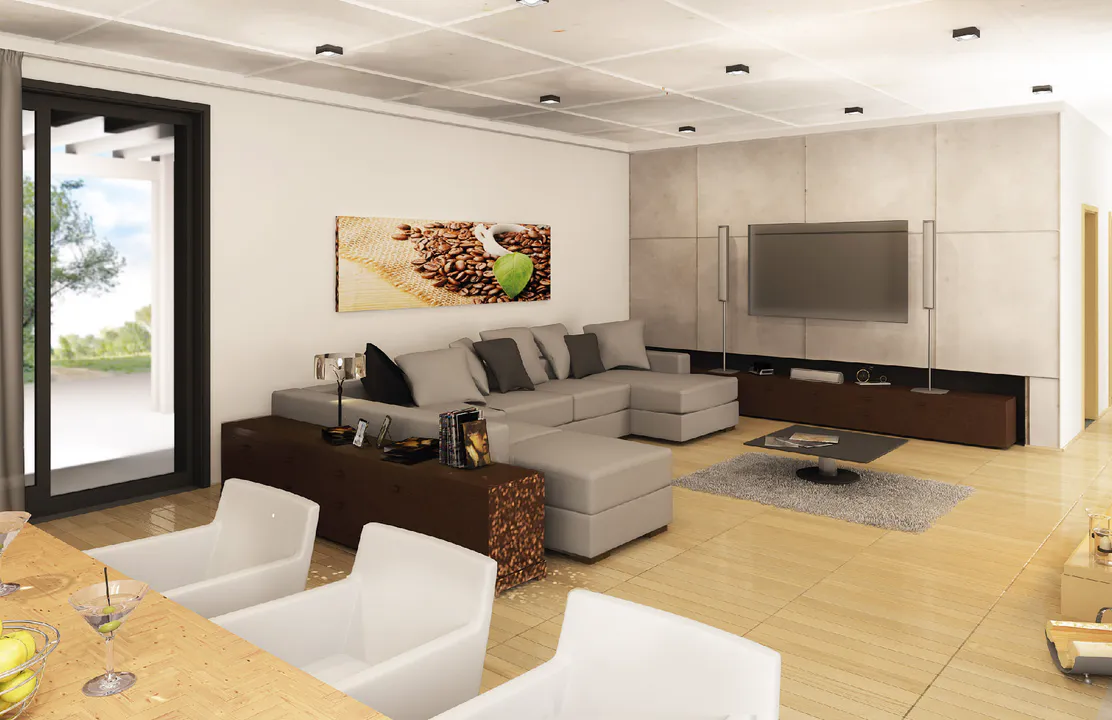 Внутреннее пространство создает ощущение комфорта и удобства, а также интимности за счет функционального разделения здания на дневную и ночную зоны.
