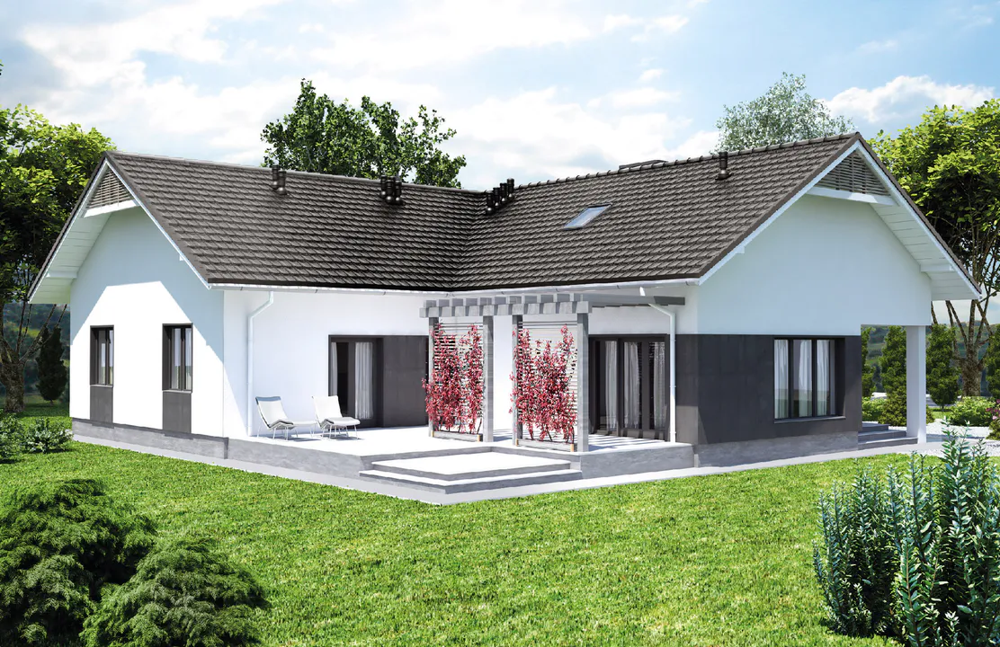 Форма дома простая, крыша двускатная, покрытая серой керамической черепицей. Обращает на себя внимание модное цветовое сочетание отделочных материалов — белого и серого, — обогащающее эстетические ценности и подчеркивающее современный стиль здания.