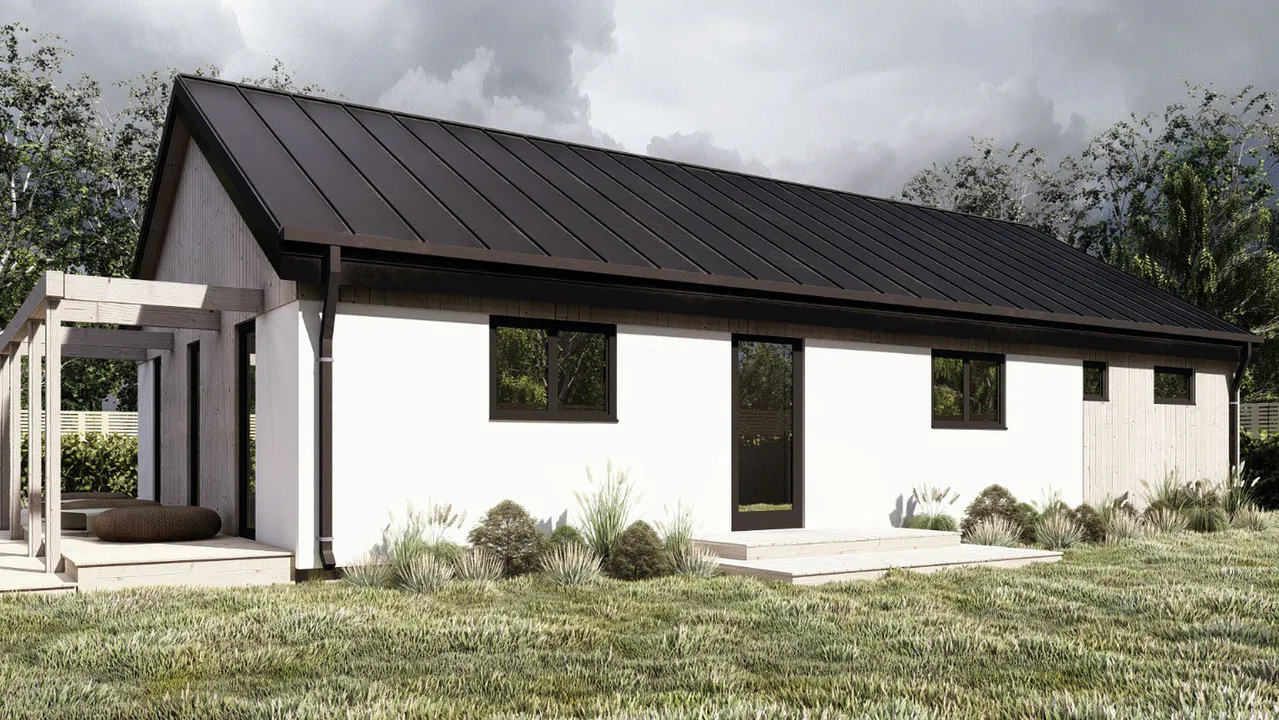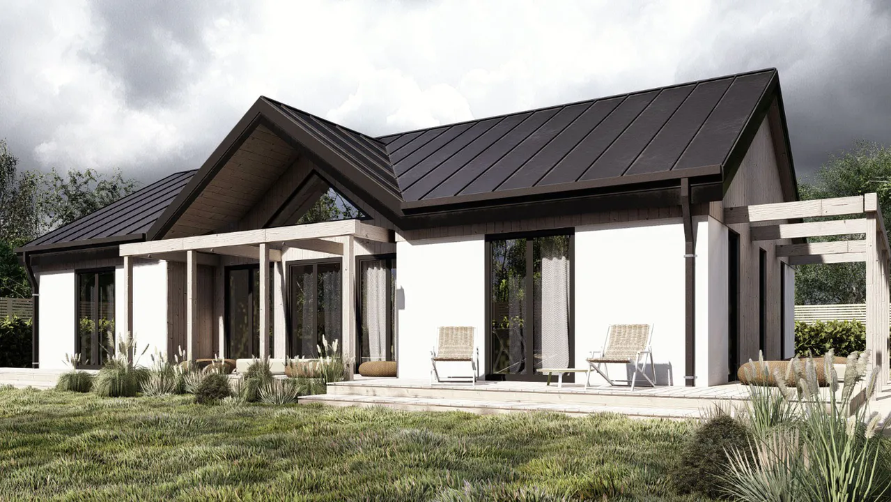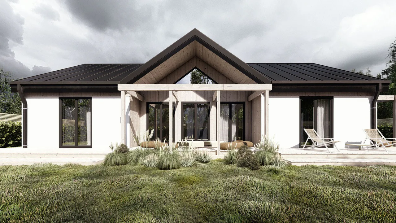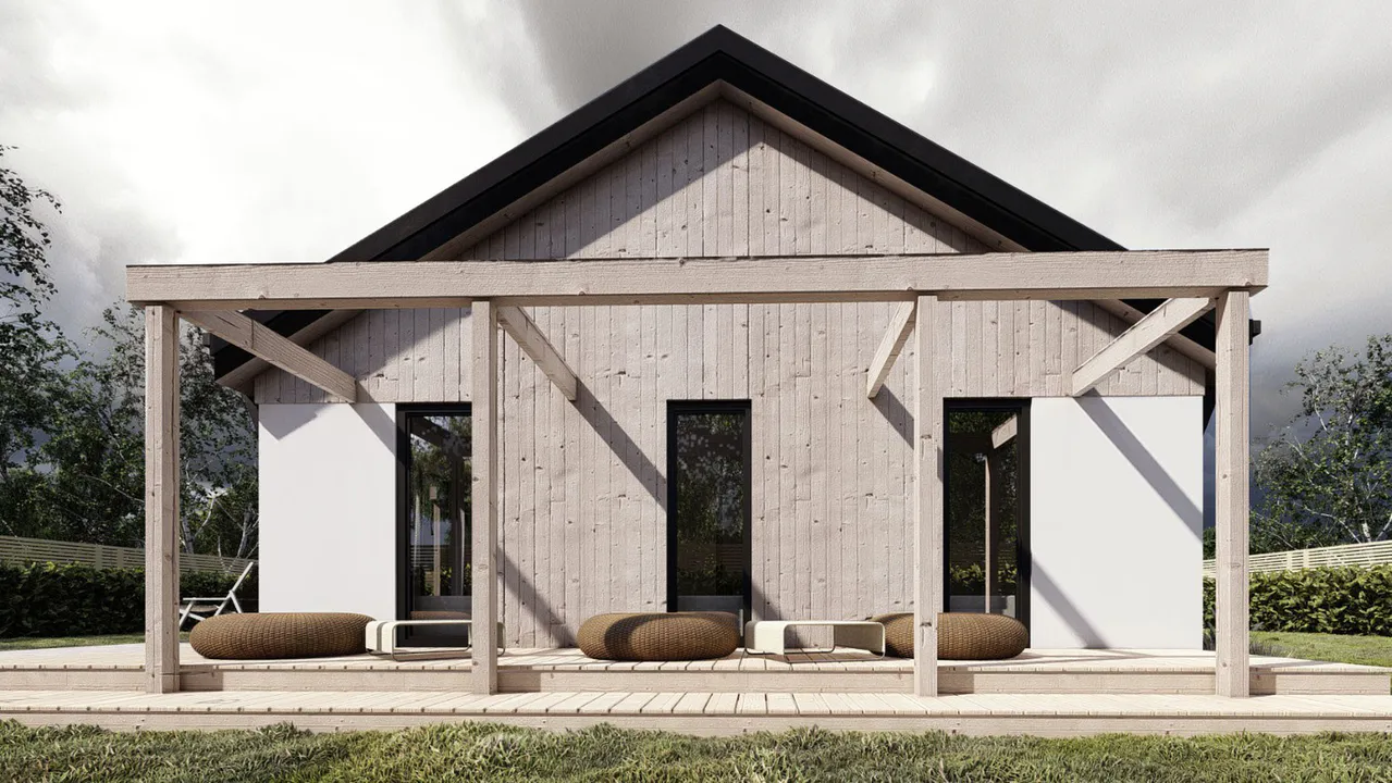 У дома двускатная крыша темного цвета, которая контрастирует с белыми стенами. Фасад дома частично отделан деревянными панелями светлого оттенка. Сбоку дома и сзади есть терраса с простой деревянной конструкцией.