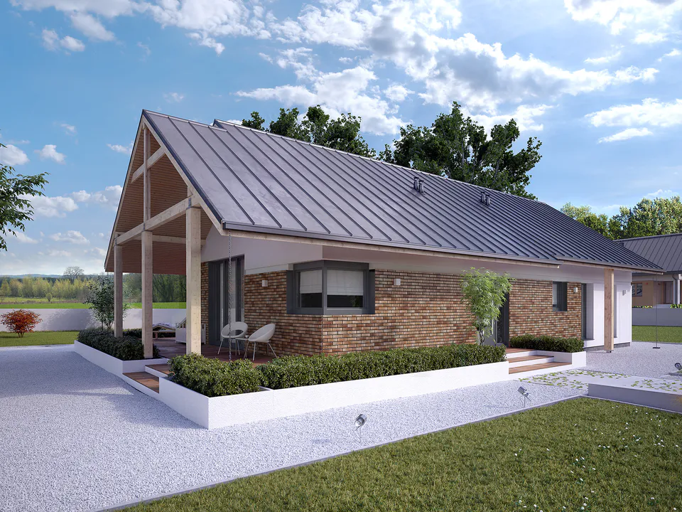 Проект небольшого одноэтажного дома с двускатной крышей и террасой.