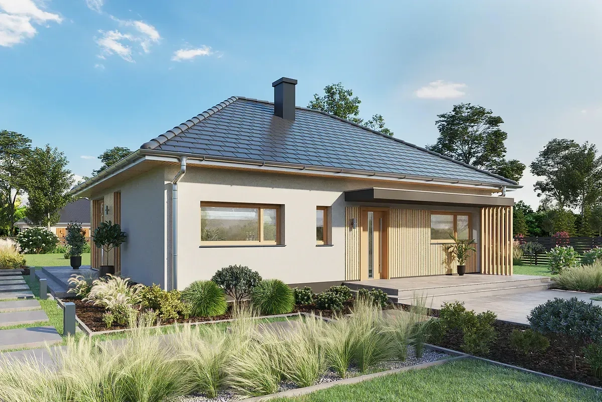 Проект небольшого дома подходит для круглогодичного проживания, а также сезонного отдыха с летними террасами.